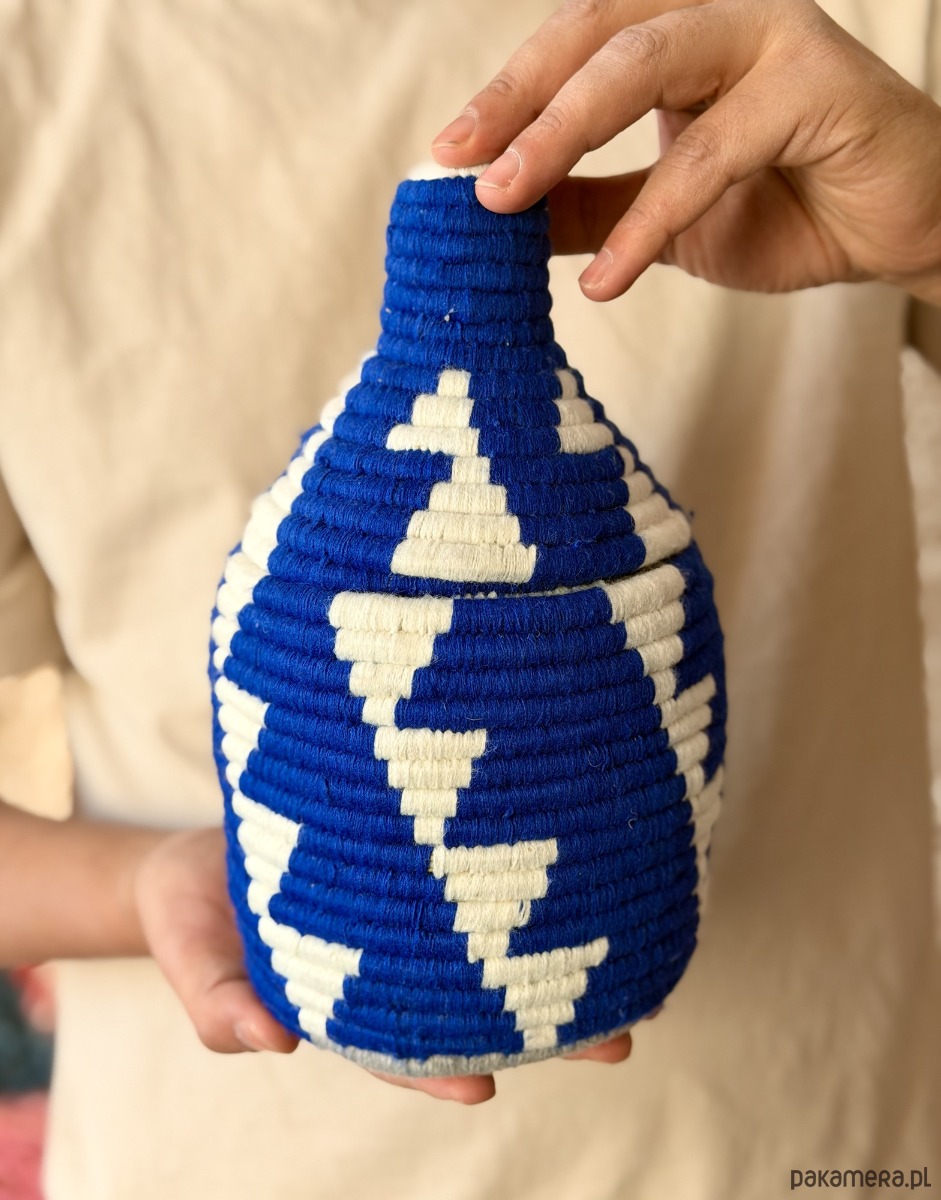Każdy koszyk powstaje w całości ręcznie, dzięki czemu jest unikatowy i posiada różnice w splocie oraz wzorze — to znak autentycznego rękodzieła, a nie masowej produkcji. Taki koszyk dekoracyjny doskonale wpisuje się w styl boho, etno, japandi i nowoczesne wnętrza, wnosząc do nich kolor, teksturę i ciepło.