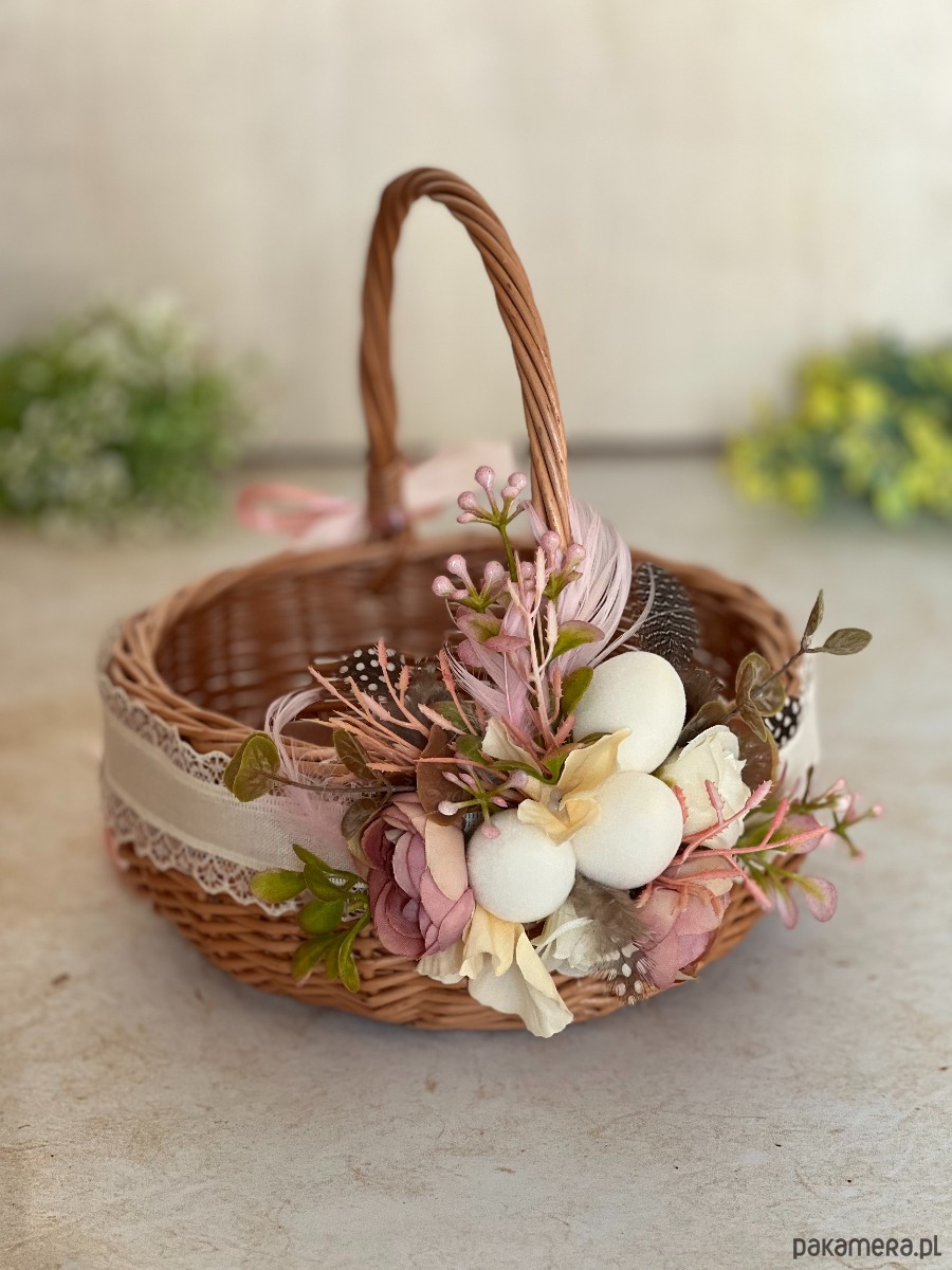 Koszyczek wielkanocny z naturalnej wikliny, ozdobiony kwiatami i dodatkami sztucznymi. Dekoracja na stałe przymocowana do koszyczka, przygotowana przeze mnie ręcznie :)