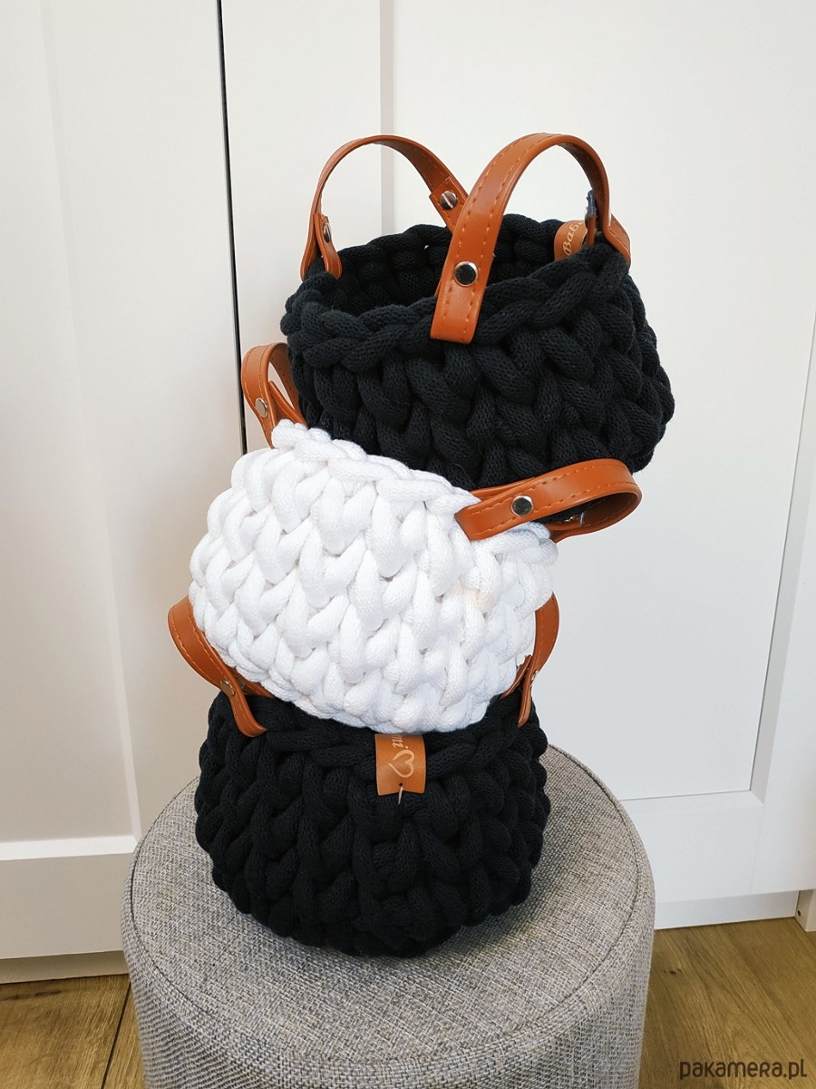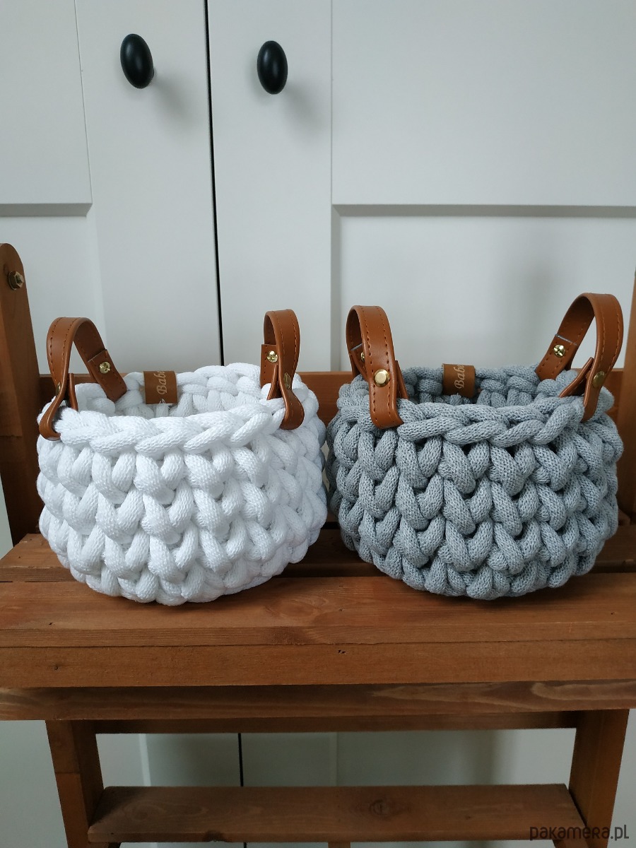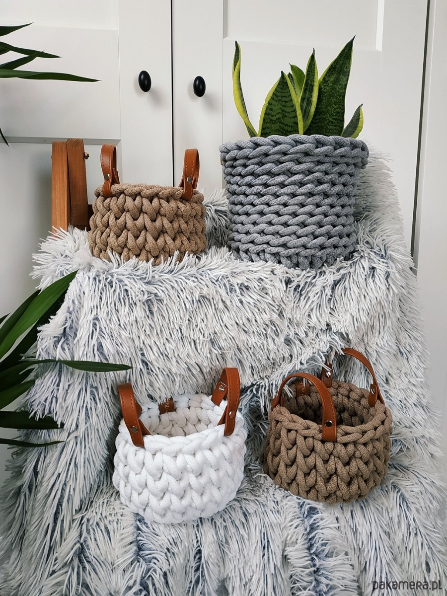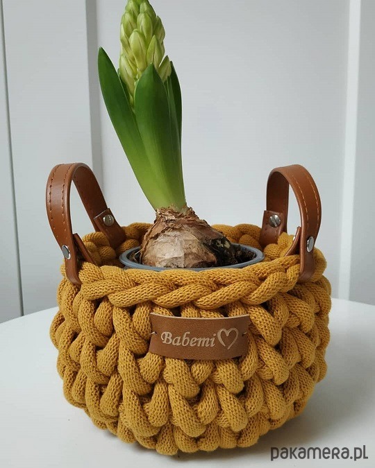 Kubełek wykonany z bardzo grubego sznurka z uszami z ekoskóry.