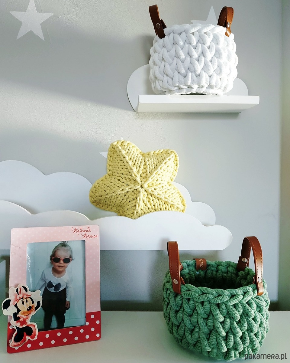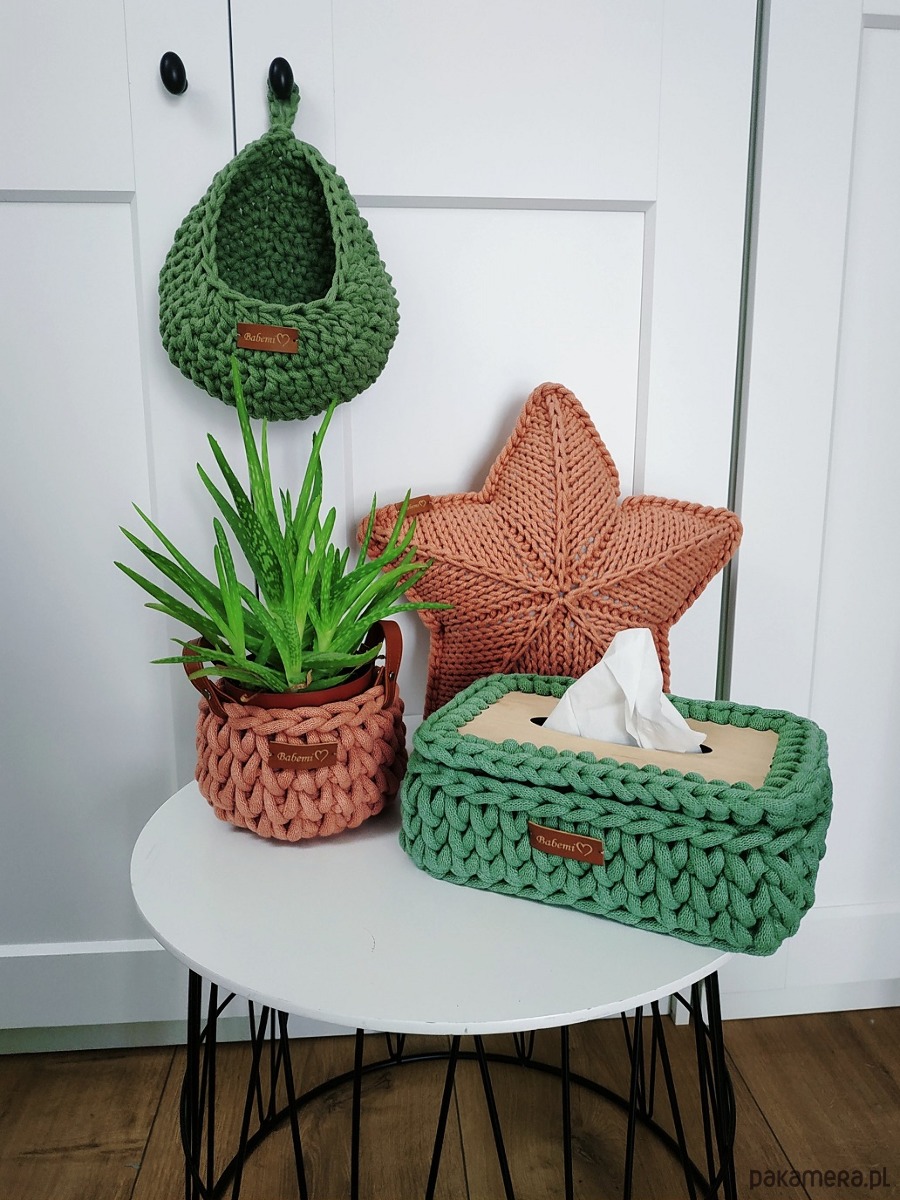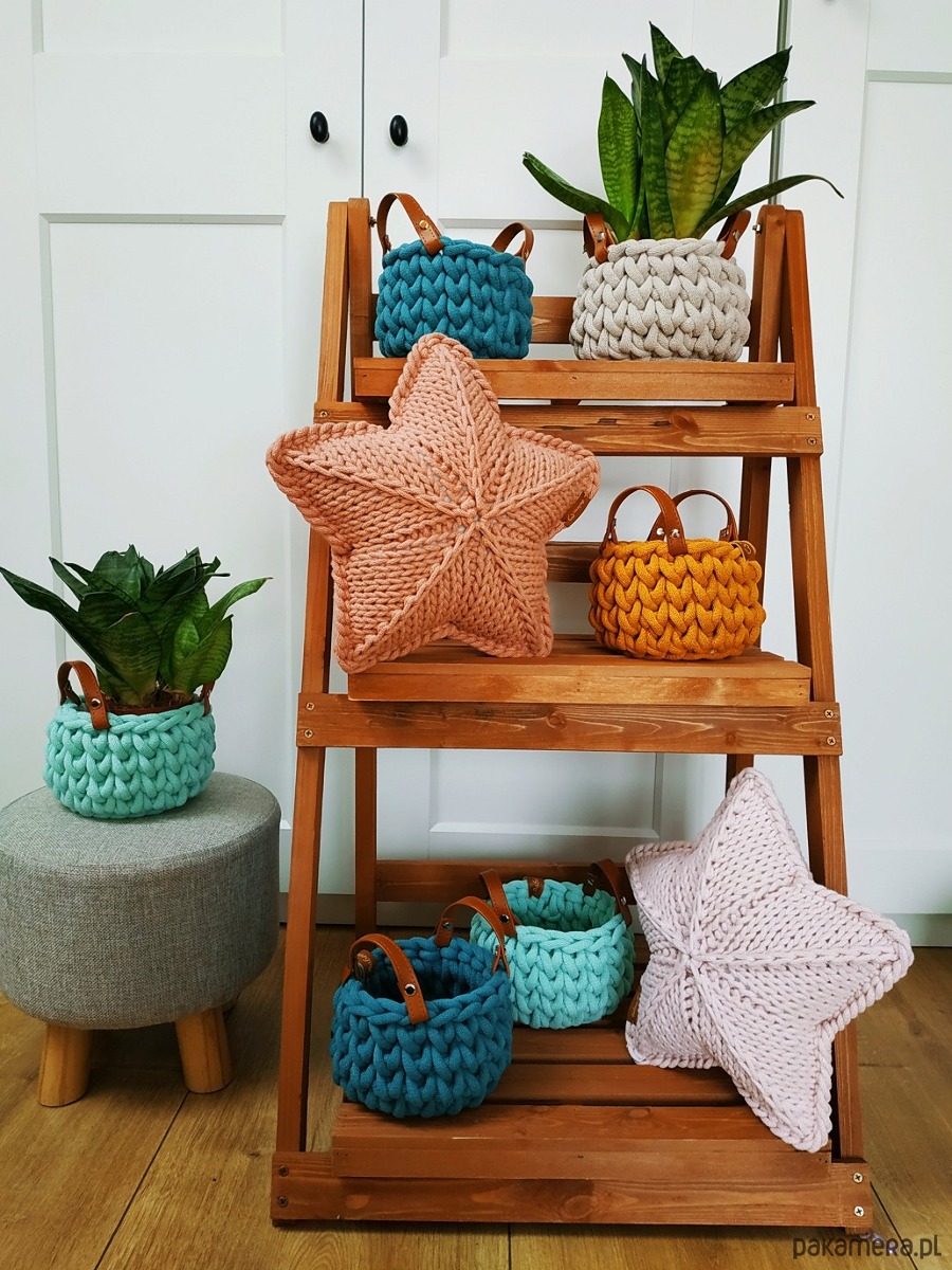 Kubełek wykonany z bardzo grubego sznurka z uszami z ekoskóry.