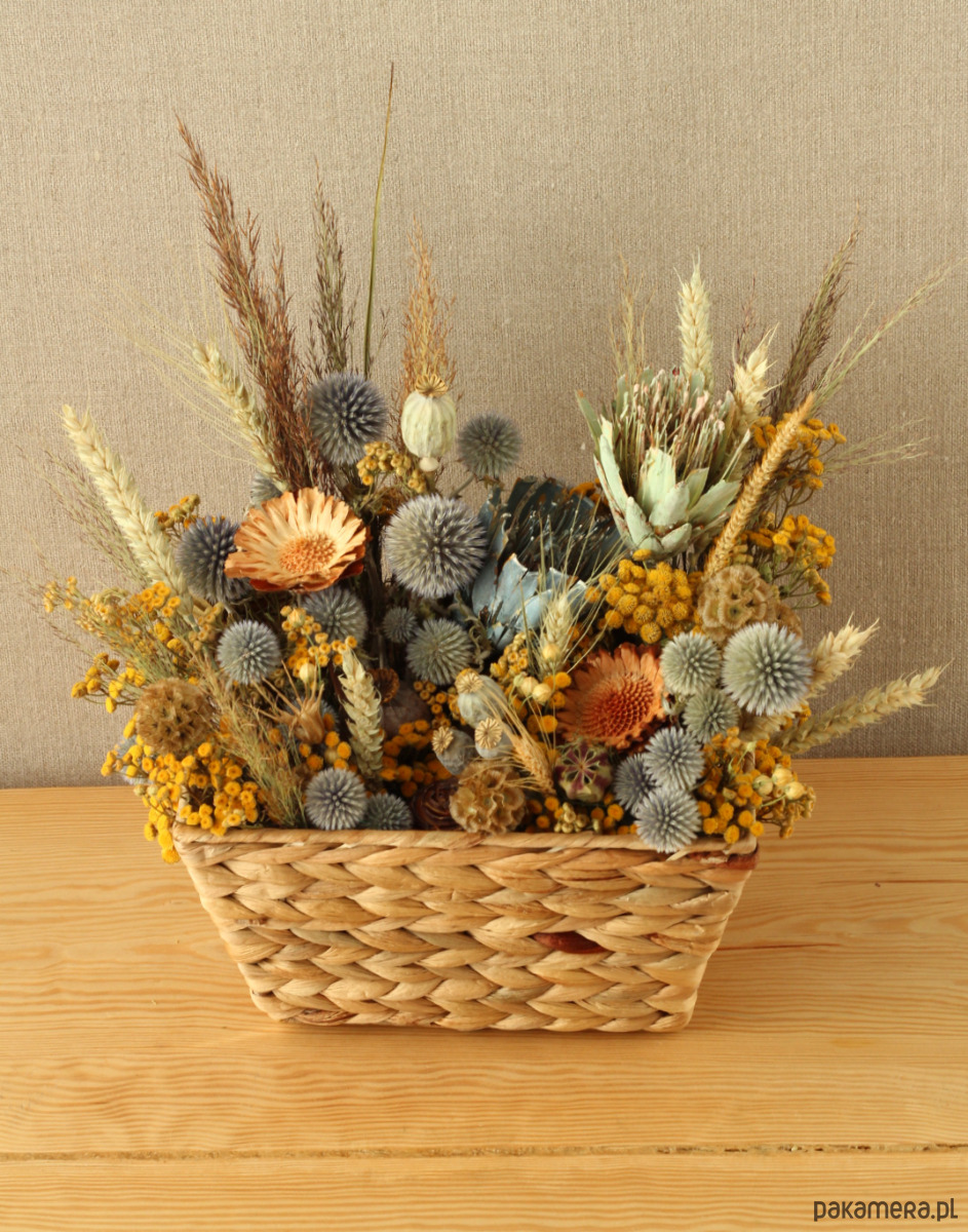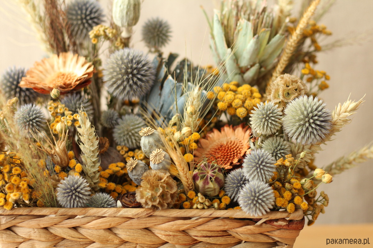 Kompozycja z kwiatów suszonych w pięknym plecionym koszyku z hiacyntu wodnego.
