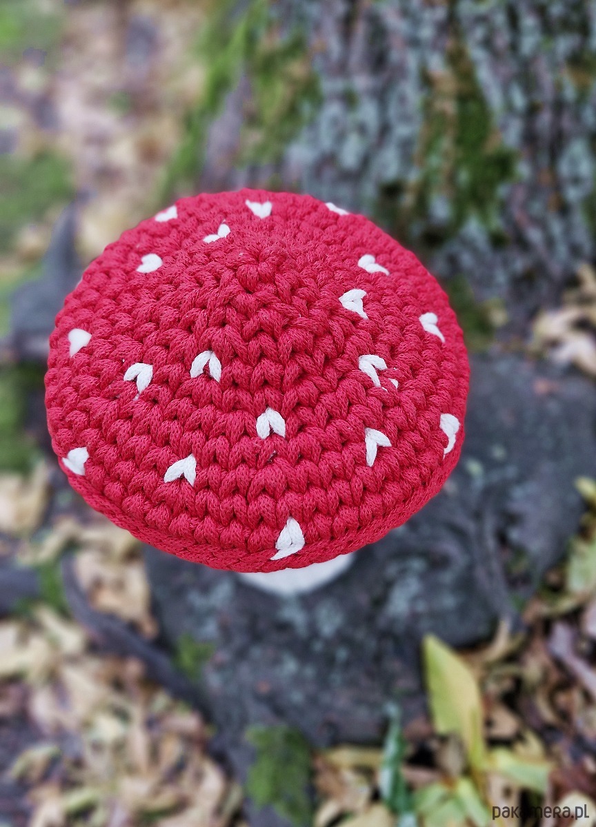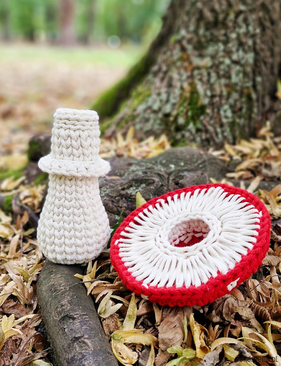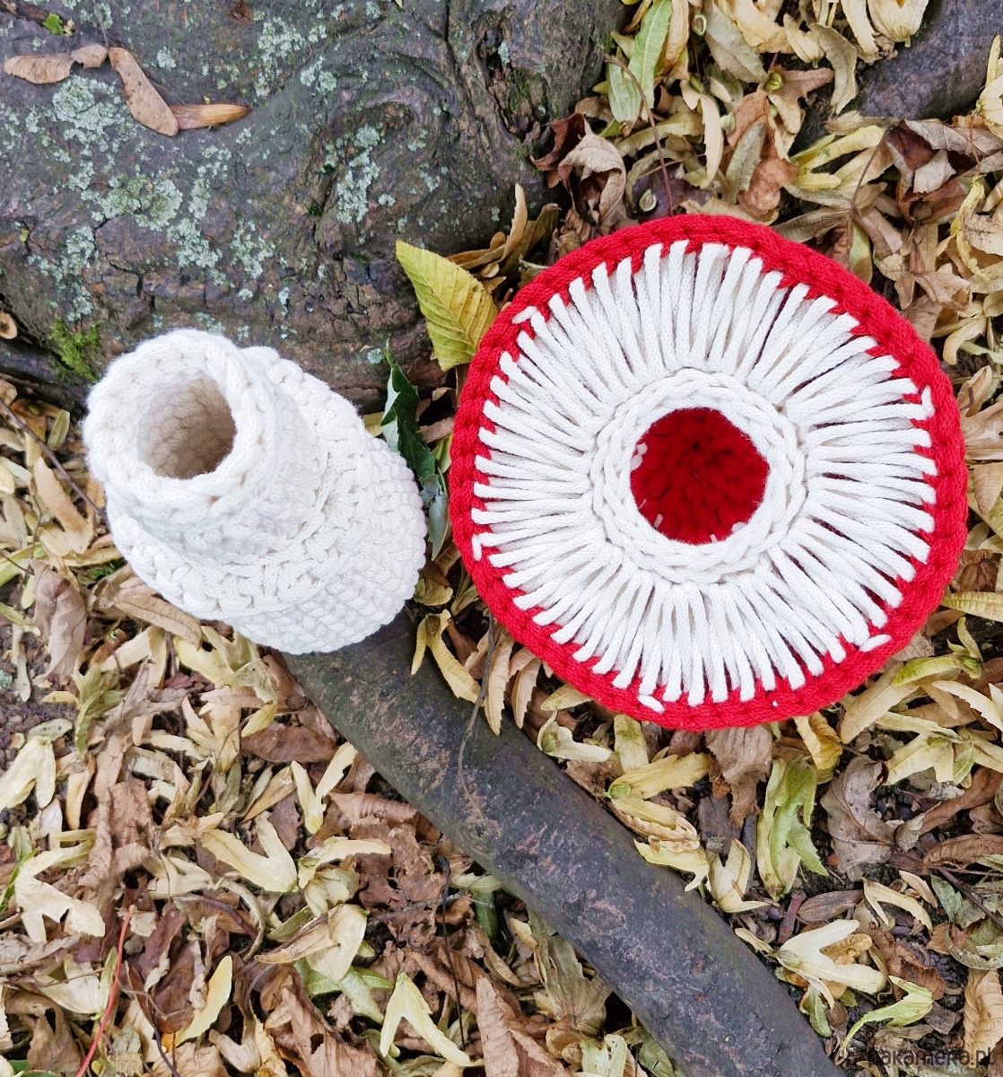Koszyk - dekoracja jesienna w formie muchomora świetnie sprawdzi się zarówno w pokoju dziecięcym jak i w przedpokoju jako schowek na drobiazgi np. klucze. Wieczko koszyka przypomina kapelusz grzyba, który nakłada się na nóżkę lekko dociskając. Wykonałam go ręcznie ze sztywnego bawełnianego sznurka z rdzeniem.