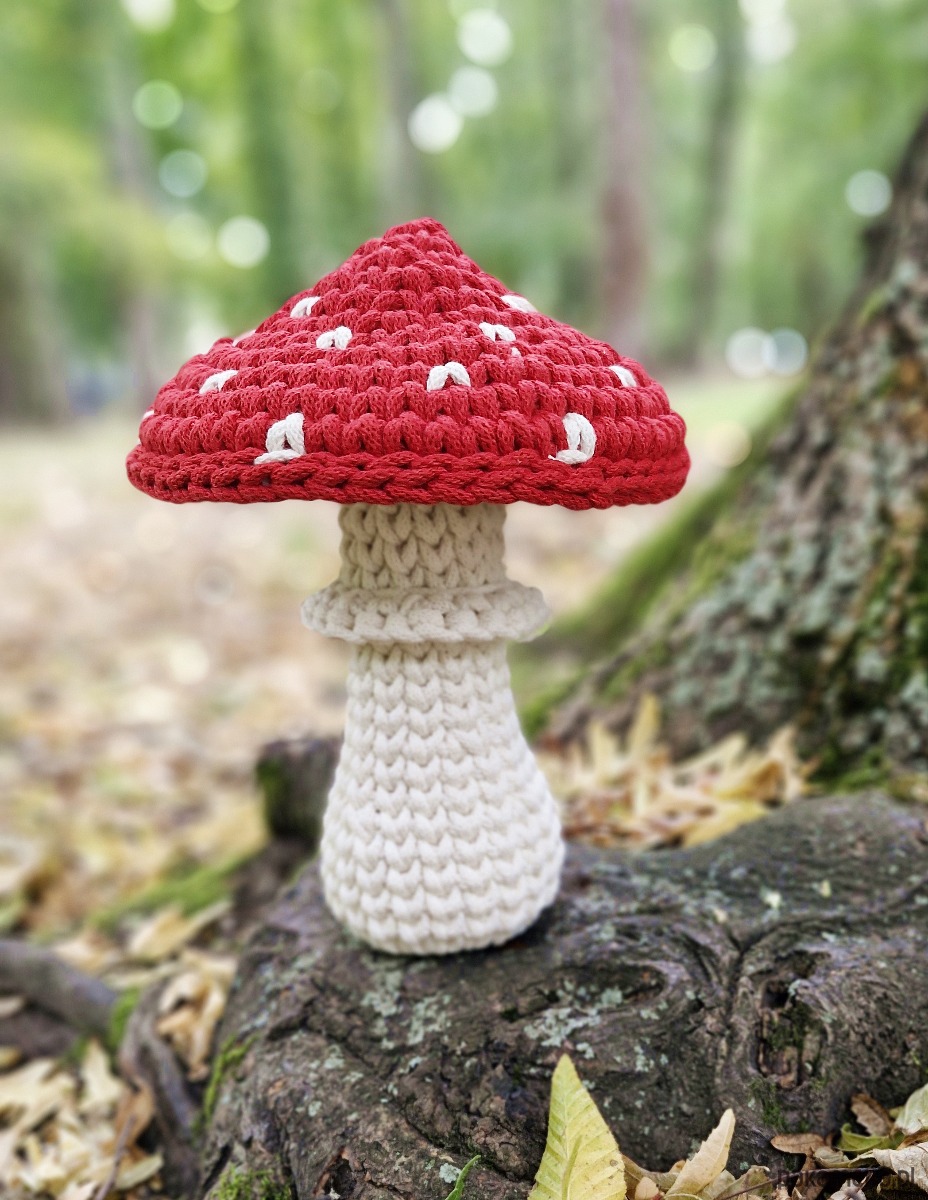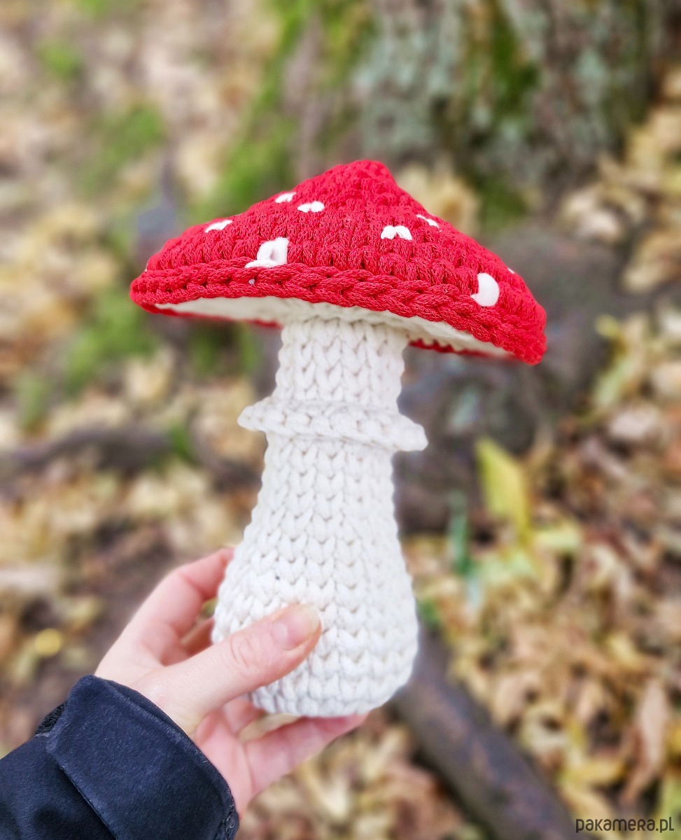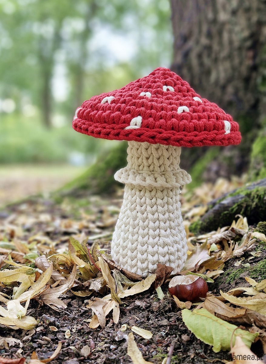 Koszyk - dekoracja jesienna w formie muchomora świetnie sprawdzi się zarówno w pokoju dziecięcym jak i w przedpokoju jako schowek na drobiazgi np. klucze. Wieczko koszyka przypomina kapelusz grzyba, który nakłada się na nóżkę lekko dociskając. Wykonałam go ręcznie ze sztywnego bawełnianego sznurka z rdzeniem.