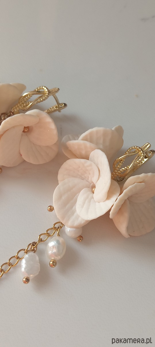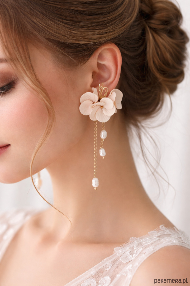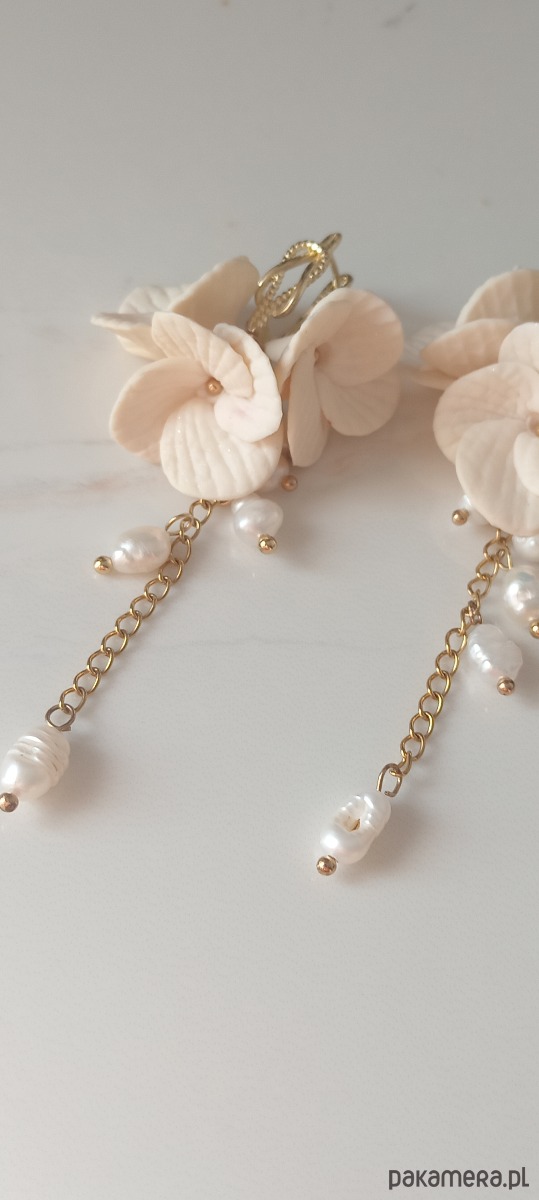 kolczyki ślubne "Biała Hortensja" z pozłacanymi okuciami. Te wykwintne dodatki doskonale uzupełnią stylizację panny młodej, dodając jej delikatności i elegancji. Wykonane ręcznie z wysokiej jakości materiałów i o niepowtarzalnym designie, są niezastąpione podczas tego wyjątkowego dnia. Podaruj sobie lub bliskiej osobie te urocze kolczyki!