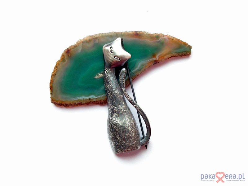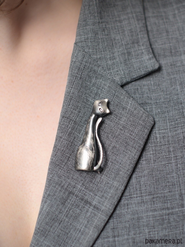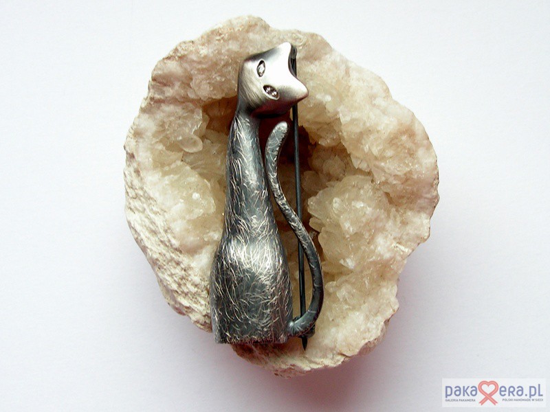 Srebrna broszka w kształcie leniwego kota. Pokryta oksydą. W oczkach umieszczone zostały białe cyrkonie by nadać spojrzeniu blasku. Długość kota 5 cm, szerokość 2 cm. Waga:7,8 gr.