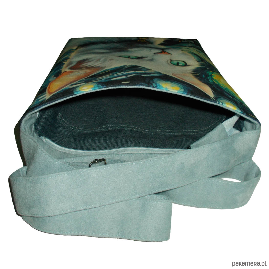 Autorska torba z usztywnionego eko zamszu, zapinana na zamek. Przód z weluru tapicerskiego. Pasek regulowany. Tył w kolorze paska (błękitny). Torba trzyma fason. Wewnątrz dwie kieszenie - jedna na zamek, druga z miejscem na telefon i coś jeszcze. W szwach wypustka. Denko poszerzone. szerokość 32cm wysokość 30cm plus denko 8cm