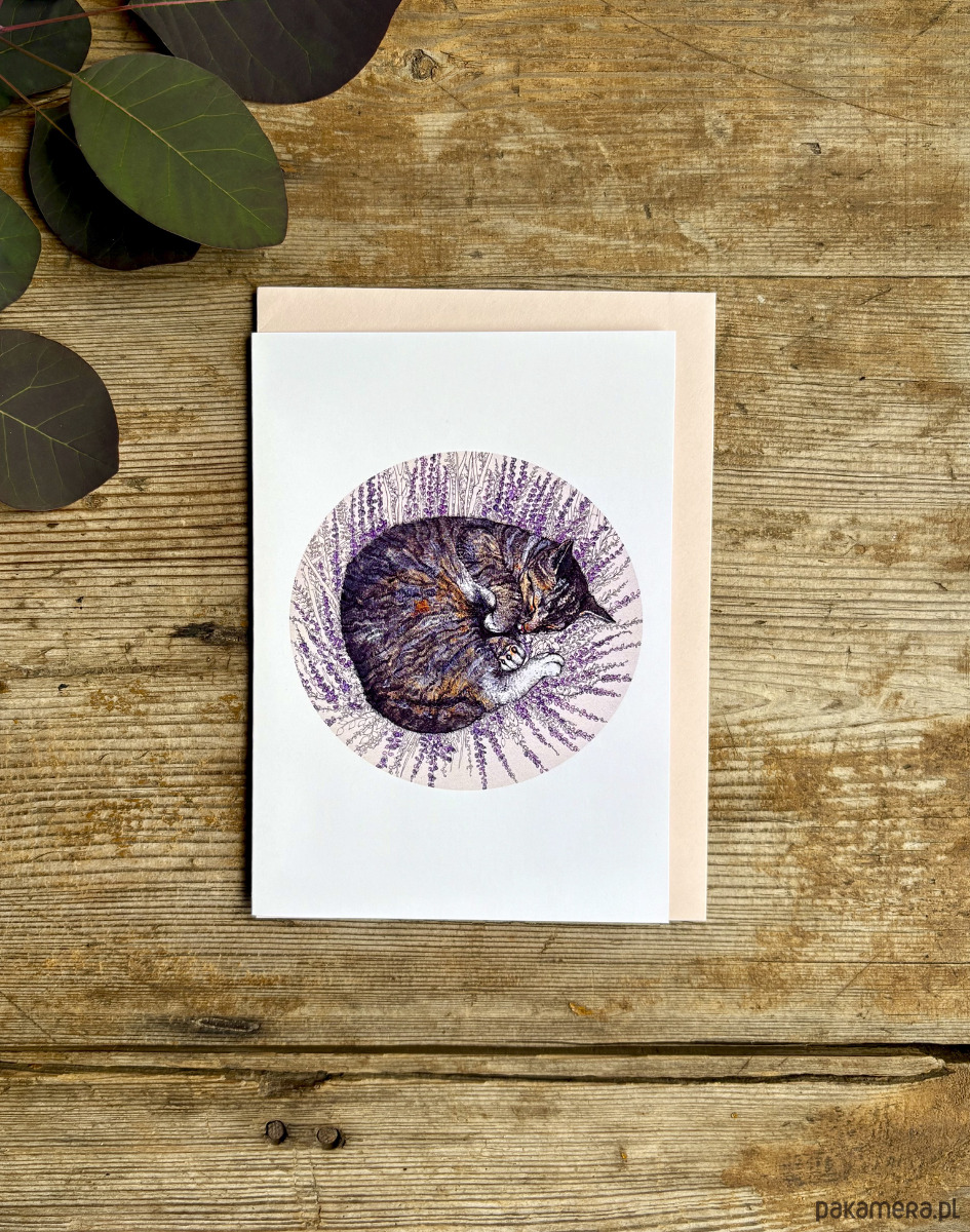 Kot we wrzosie- Kartka- Grafika- Ilustracja- Zwierzaki