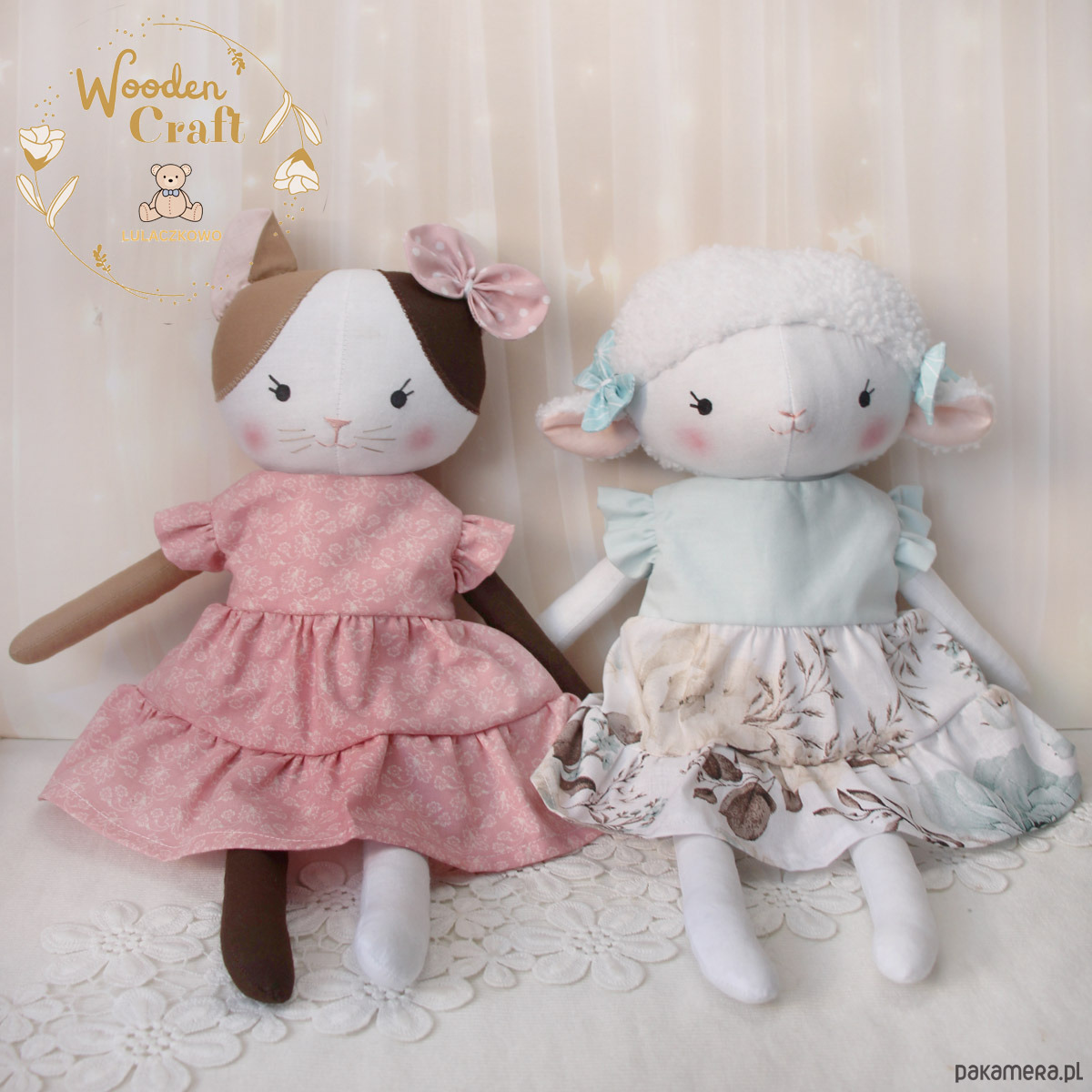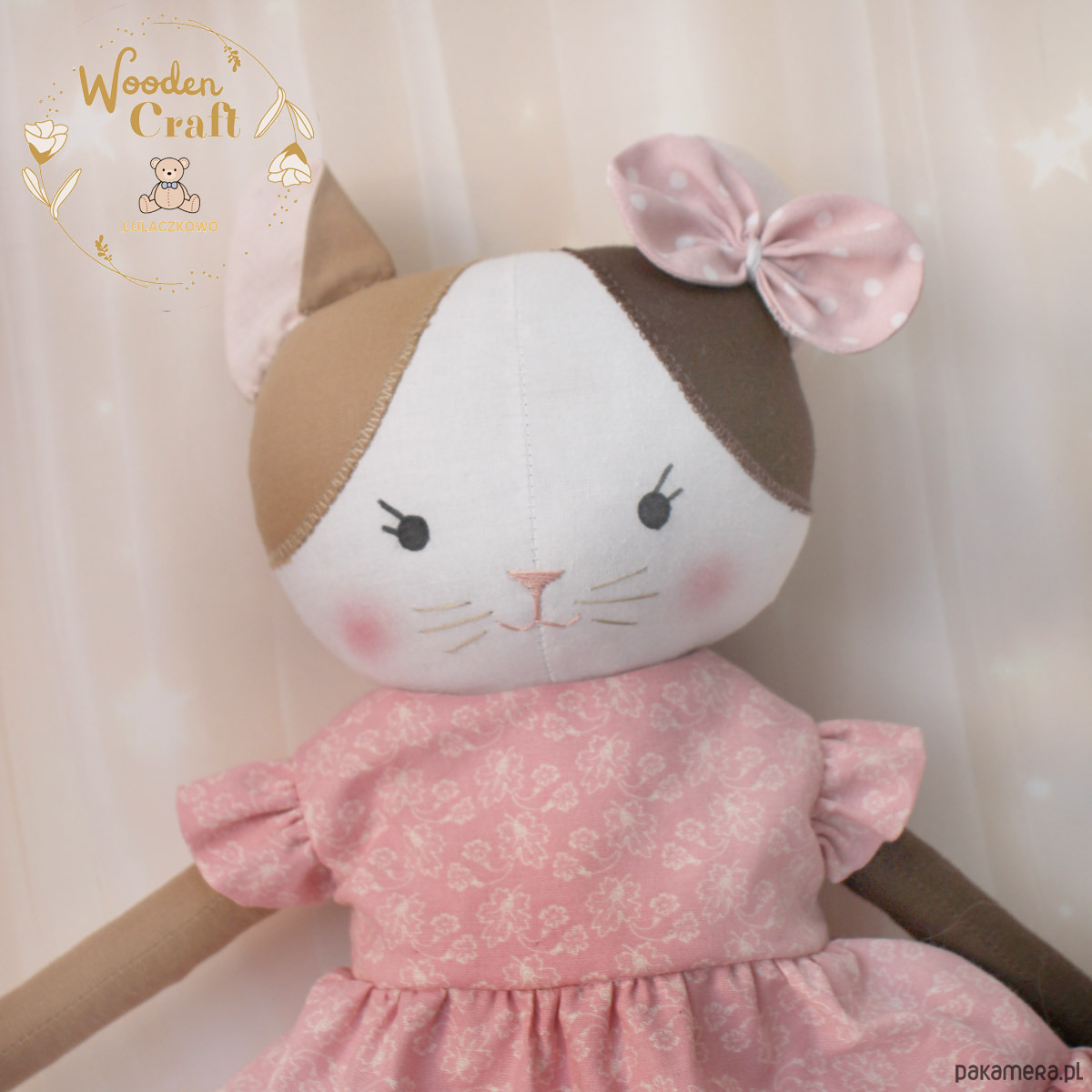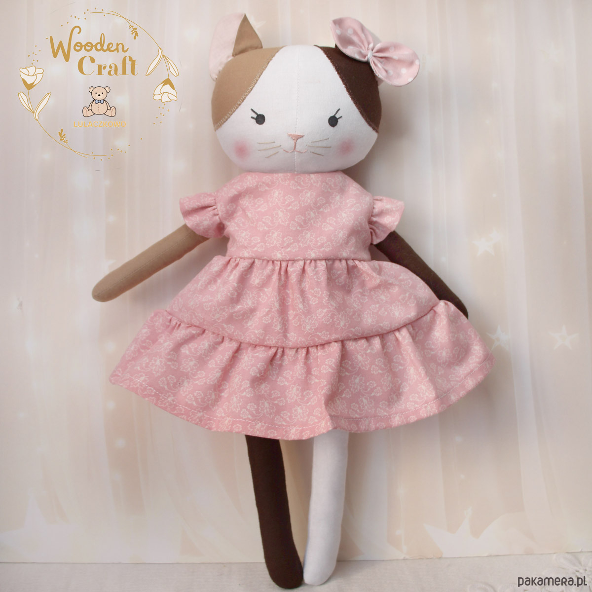 Przeurocza przytulanka, Kicia trikolorka uszyta ręcznie z najwyższą starannością, ubrana w sukieneczkę w kolorze różowym, w drobne kwiatuszki. Wykonana ze 100% bawełny, wypełniona antyalergiczną kulką silikonową. Oczka malowane wodoodpornym markerem, nosek i uśmiech wyszyty muliną, uszko ozdobione kokardką. Górne i dolne łapki układają się luźno, kicia siedzi z podparciem. Sukieneczkę można swobodnie zdejmować, jest zapinana na rzep.