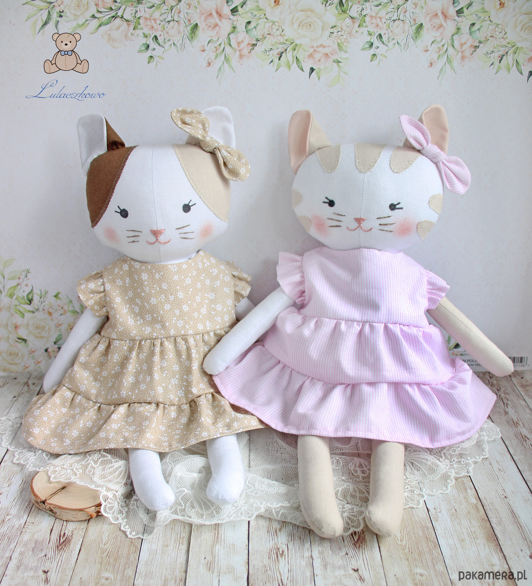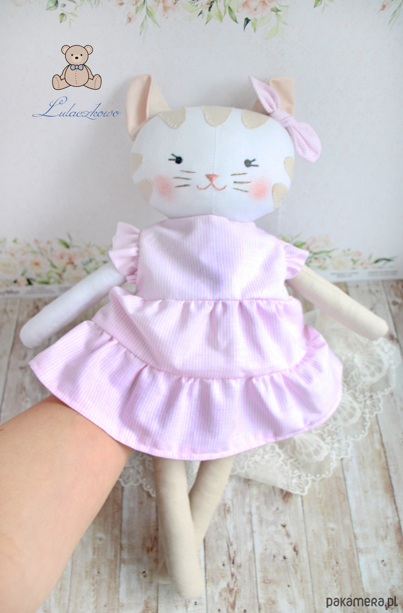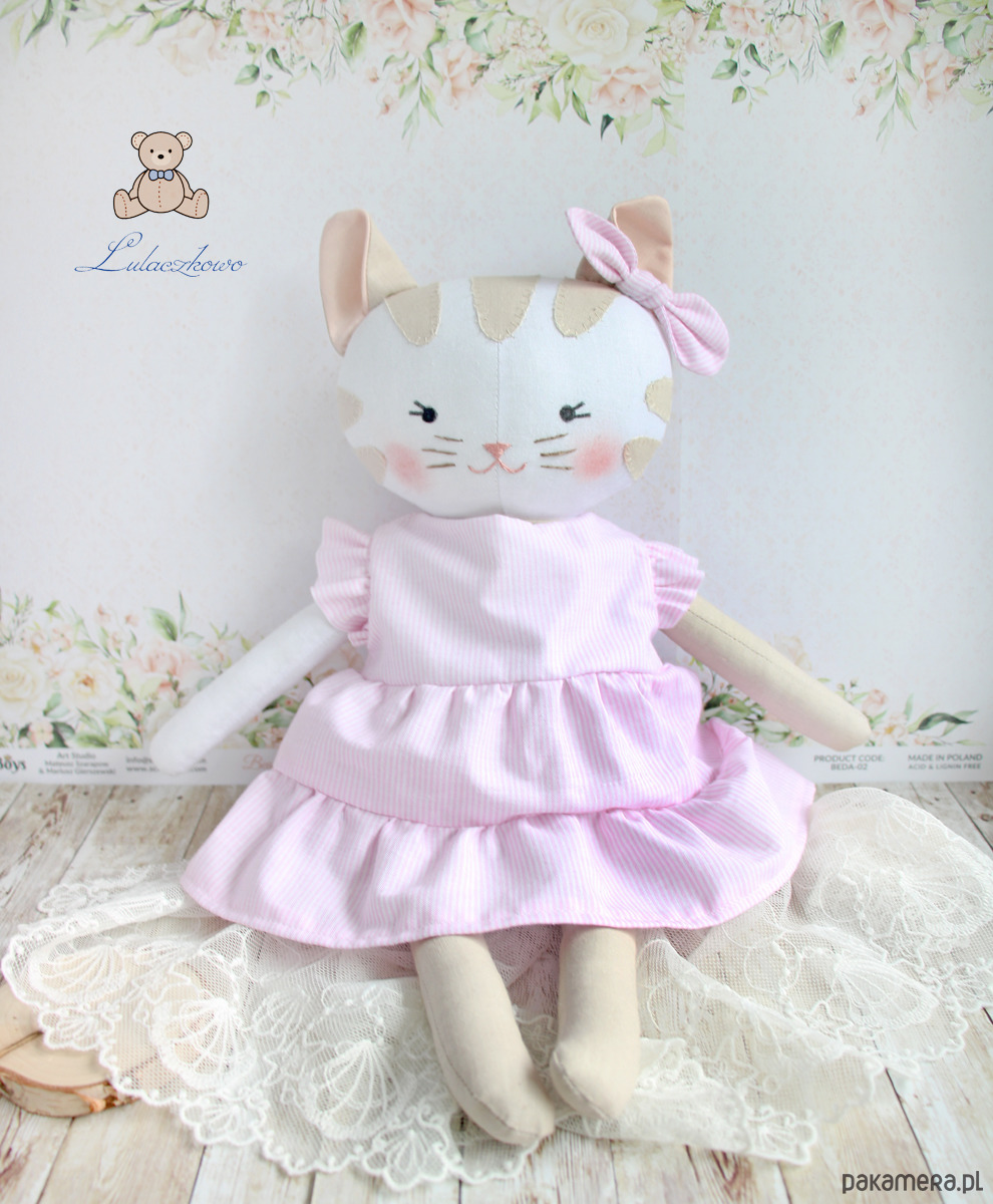 Przeurocza przytulanka, Kicia z beżowymi łatkami, uszyta ręcznie z najwyższą starannością, ubrana w pudrowo-różową sukieneczkę z falbankami. Wykonana ze 100% bawełny, wypełniona antyalergiczną kulką silikonową. Oczka malowane wodoodpornym markerem, nosek, wąsy i uśmiech wyszyty muliną, uszko ozdobione kokardką. Sukieneczkę można swobodnie zdejmować, zapinana jest na rzep. Górne i dolne łapki układają się luźno, kicia siedzi z podparciem.