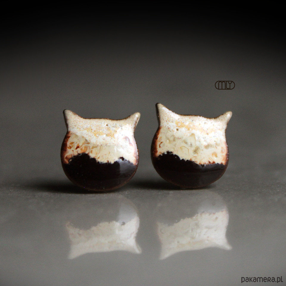 Efektowne ceramiczne kolczyki kotki w formie sztyftów, ręcznie wykonane z delikatnej gliny kamionkowej, jednostronnie szkliwione mieszanką beżowo brązowych nakrapianych szkliw, na sztyftach ze stali chirurgicznej w kolorze srebrnym. długość elementu ceramicznego ok. 10mm, Polecam