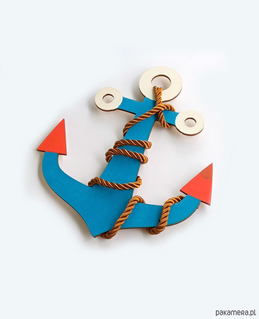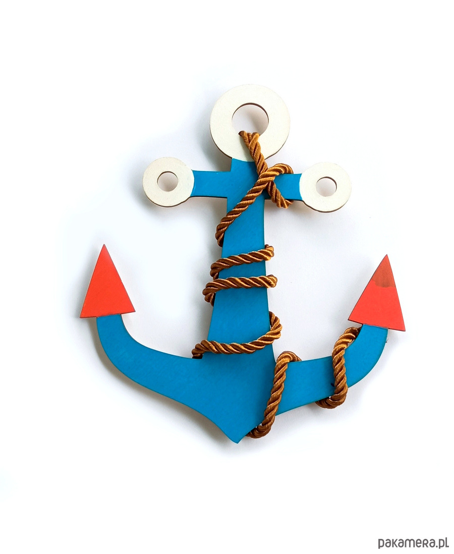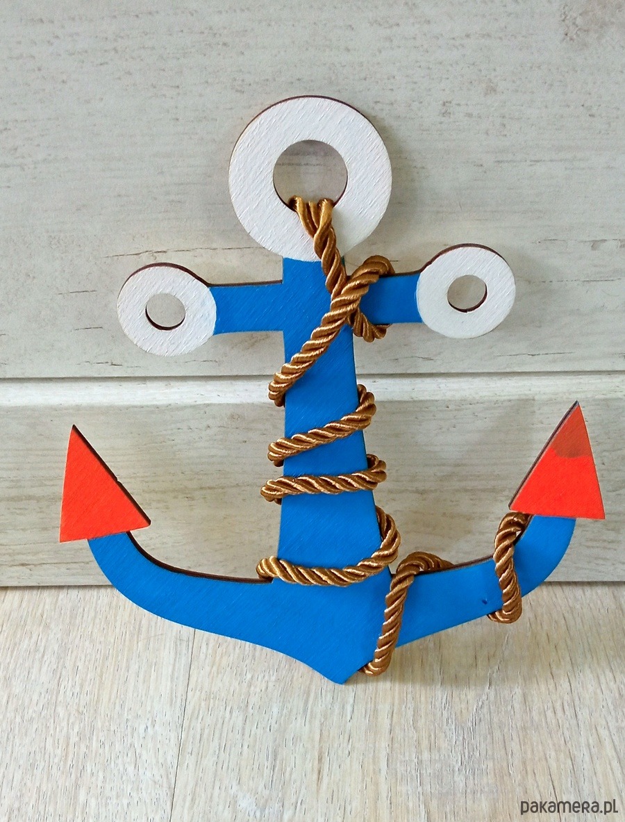 Kotwica wykonana ze sklejki, malowana farbami akrylowymi, zdobiona ozdobnym sznurkiem.