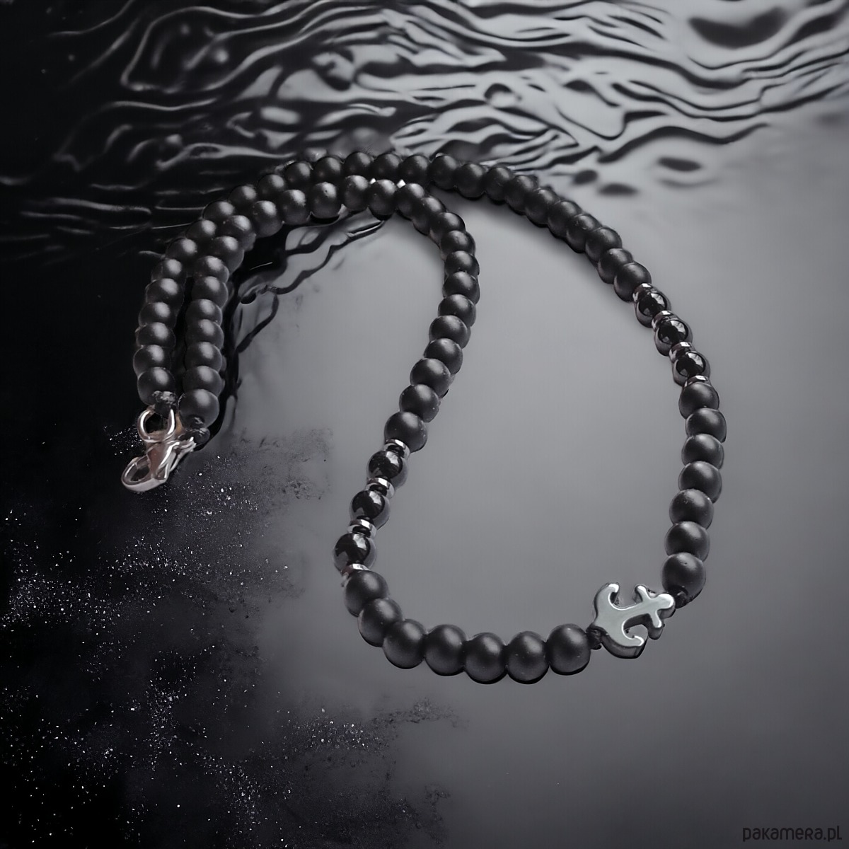 wykonany z kul matowego ONYKSU 6mm, z dodatkiem kul onyksu błysk, przekładek z hematytu, kotwicy z hematytu.