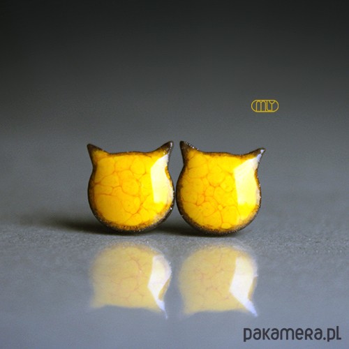 Efektowne kolczyki w formie sztyftów, ręcznie wykonane z delikatnej czekoladowobrązowej gliny kamionkowej, jednostronnie szkliwione żółtym szkliwem z efektem plamek, na antyalergicznych sztyftach w kolorze srebrnym. długość elementu ceramicznego ok. 11mm, Polecam