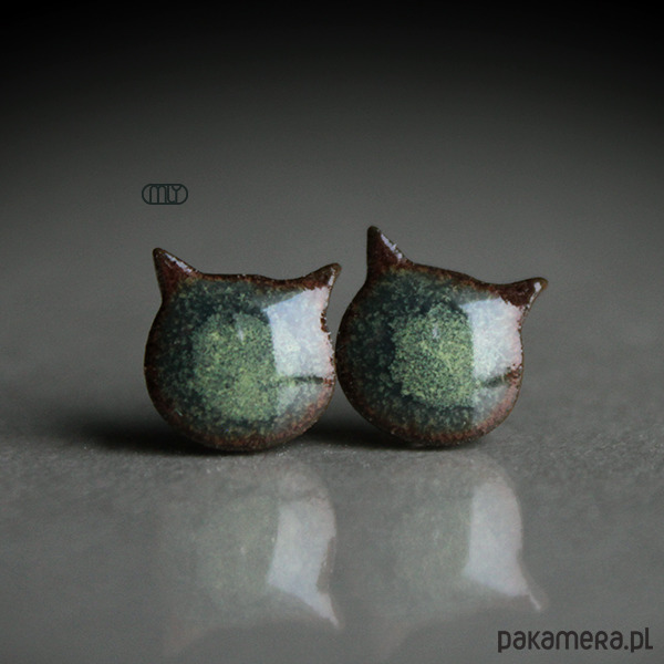 Efektowne kolczyki w formie sztyftów, ręcznie wykonane z delikatnej gliny kamionkowej, jednostronnie szkliwione szarozielonym szkliwem z efektem plamek, na antyalergicznych sztyftach w kolorze srebrnym. długość elementu ceramicznego ok. 11mm, Polecam