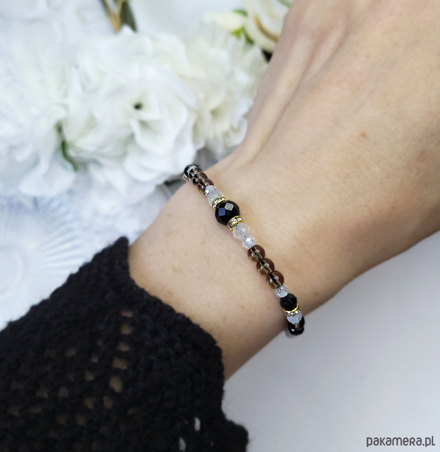 Damska bransoletka z kamieni naturalnych: Turmalinu, Kamienia księżycowego, Kwarcu dymnego oraz z Cyrkonii głównie przeznaczona dla zodiakalnego Koziorożca.