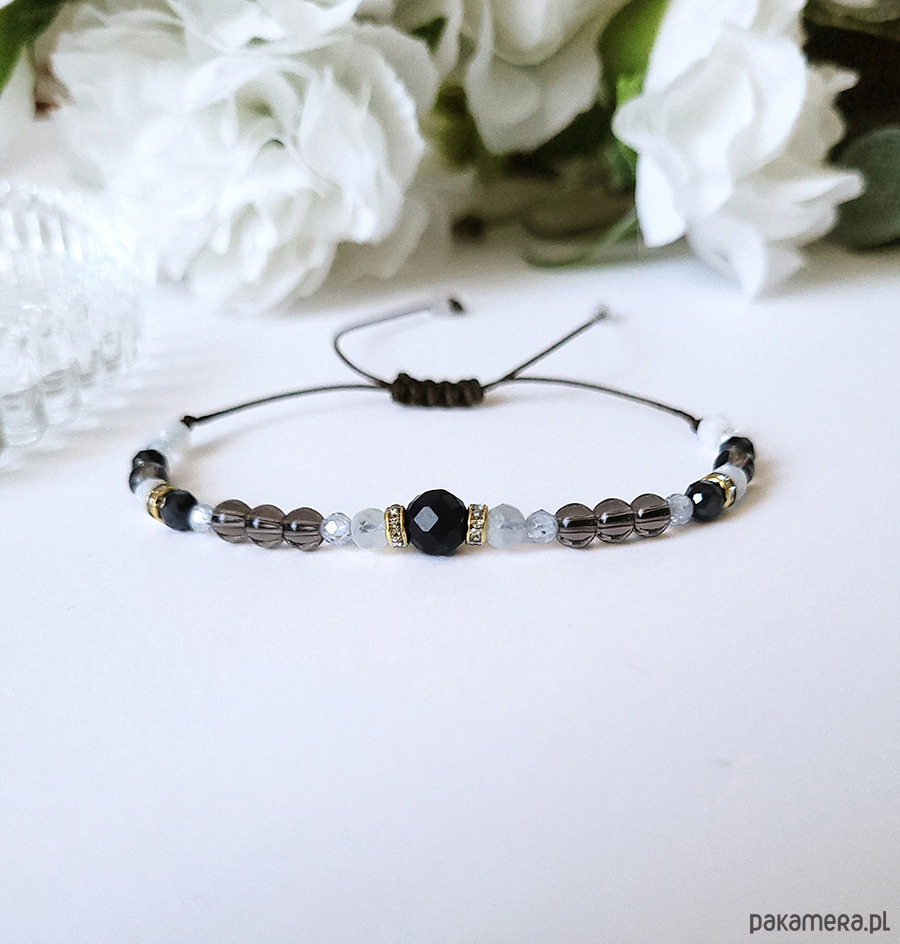 Damska bransoletka z kamieni naturalnych: Turmalinu, Kamienia księżycowego, Kwarcu dymnego oraz z Cyrkonii głównie przeznaczona dla zodiakalnego Koziorożca.