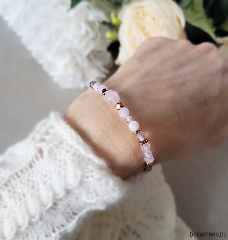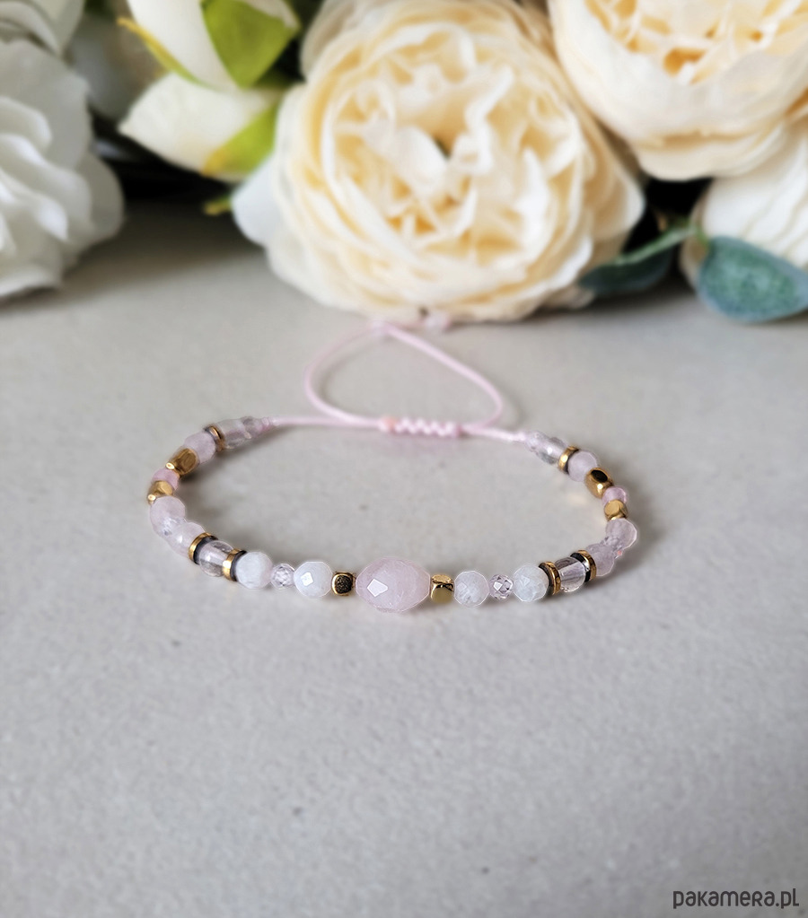 Bransoletka zrobiona z kamieni naturalnych: Kwarcu różowego, Kamienia księżycowego, Kryształu górskiego, Hematytu i Cyrkonii głównie przeznaczona dla zodiakalnego Koziorożca.