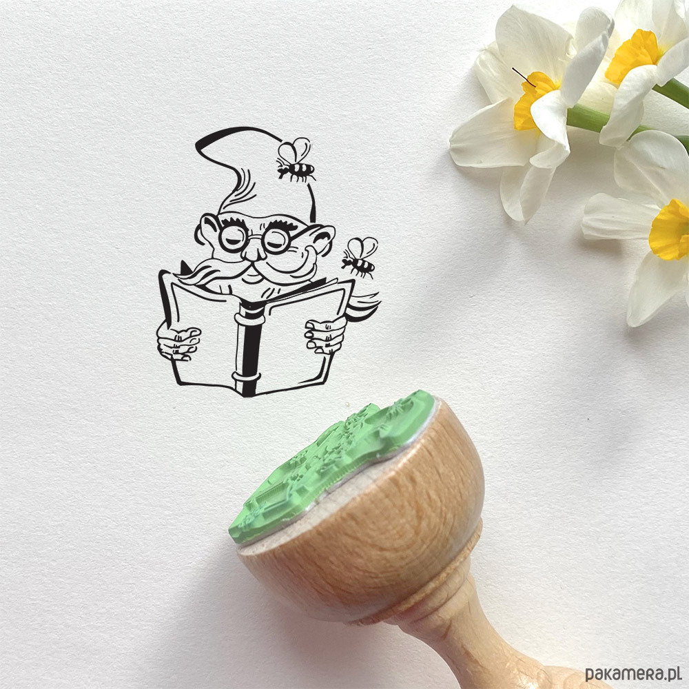 Drewniany stempel z motywem krasnala wrocławskiego czytającego książkę. Ilustracja przedstawia krasnoludka w okularach, z książką w rękach, wokół niego unoszą się pszczółki. Krasnale stały się symbolem Wrocławia - obecnie w mieście znajduje się około 900 figurek, z czego 99 sztuk na Starym Mieście.