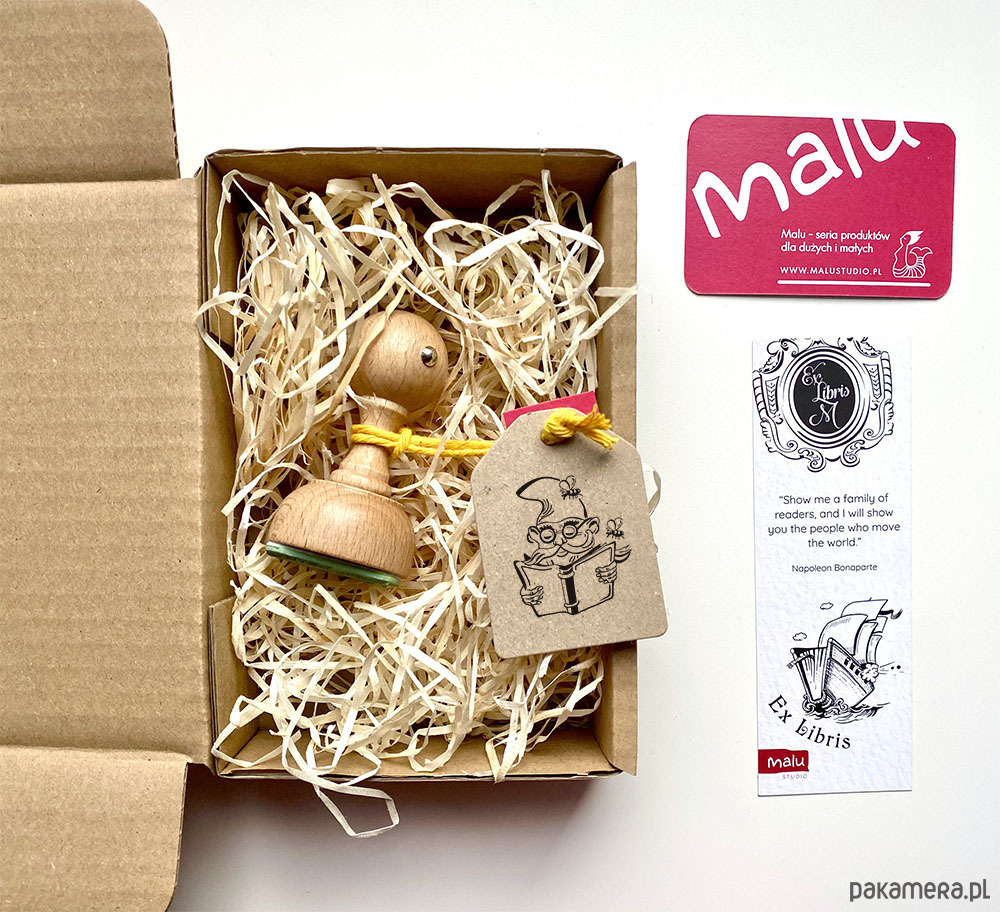 Pieczątka zapakowana jest w tekturowe ekologiczne pudełko wypełnione naturalną wełną drzewną lub ekologicznym ozdobnym wypełniaczem papierowym.