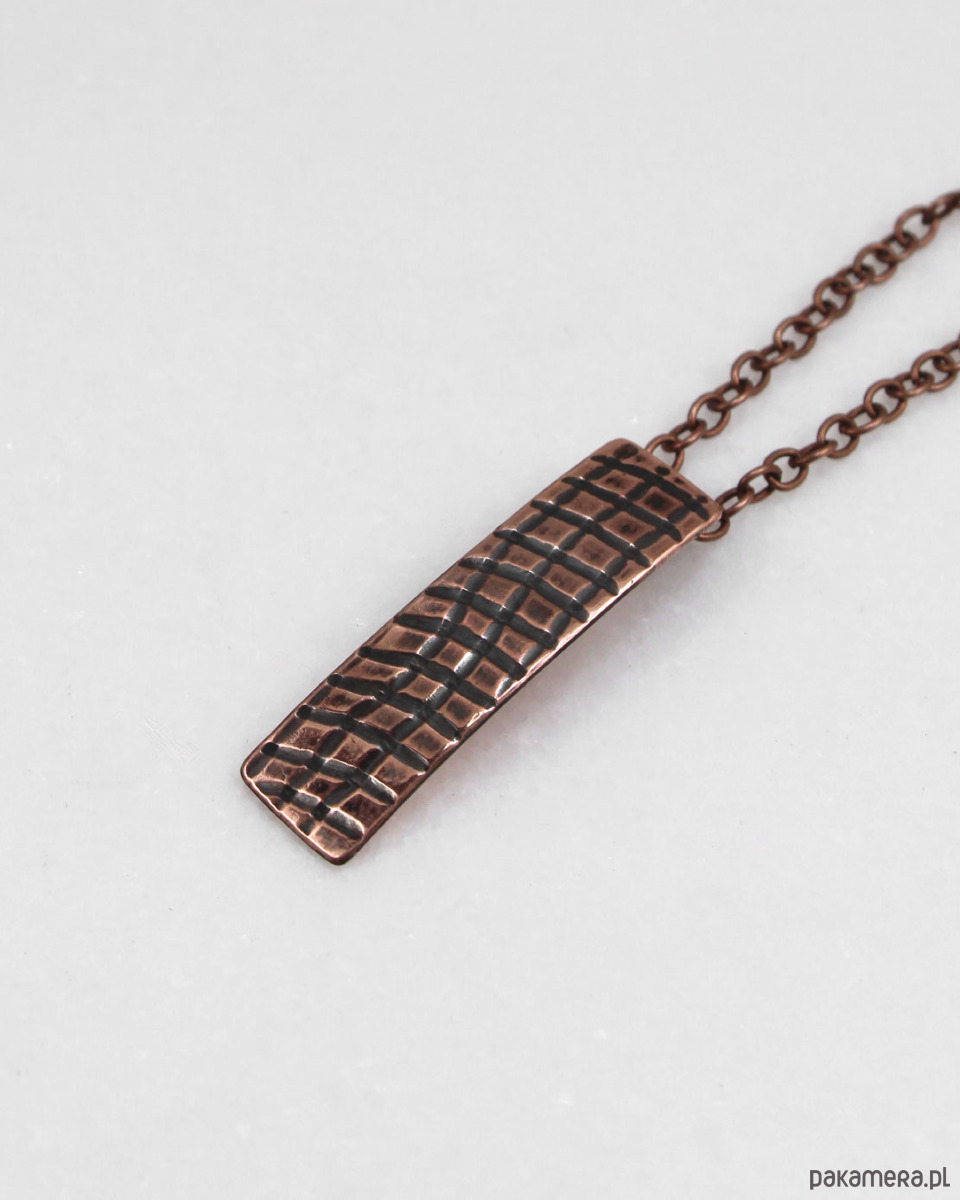Wisior został wykonany ręcznie ze szlachetnej miedzi, ma nieregularną fakturę i jest lekko patynowany w procesie oksydacji (bez użycia sztucznych barwników). Całkowita długość wisiorka to ok 3,5 cm. W komplecie łańcuszek do zawieszenia.