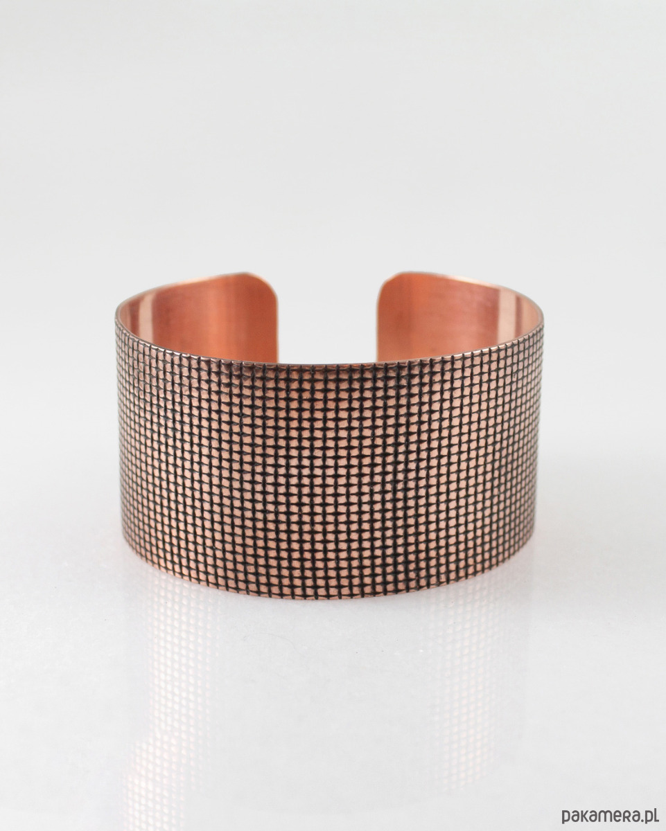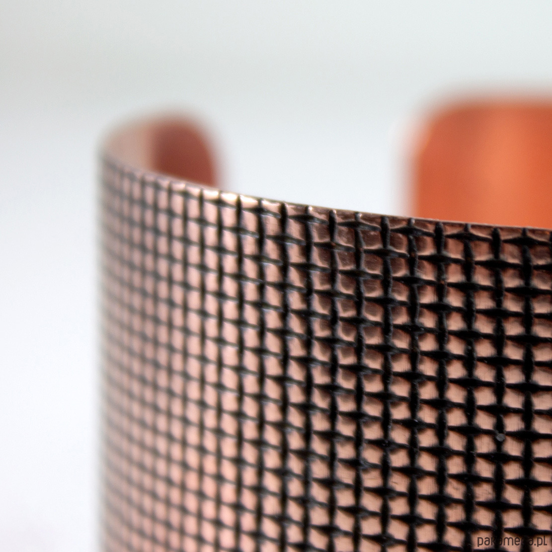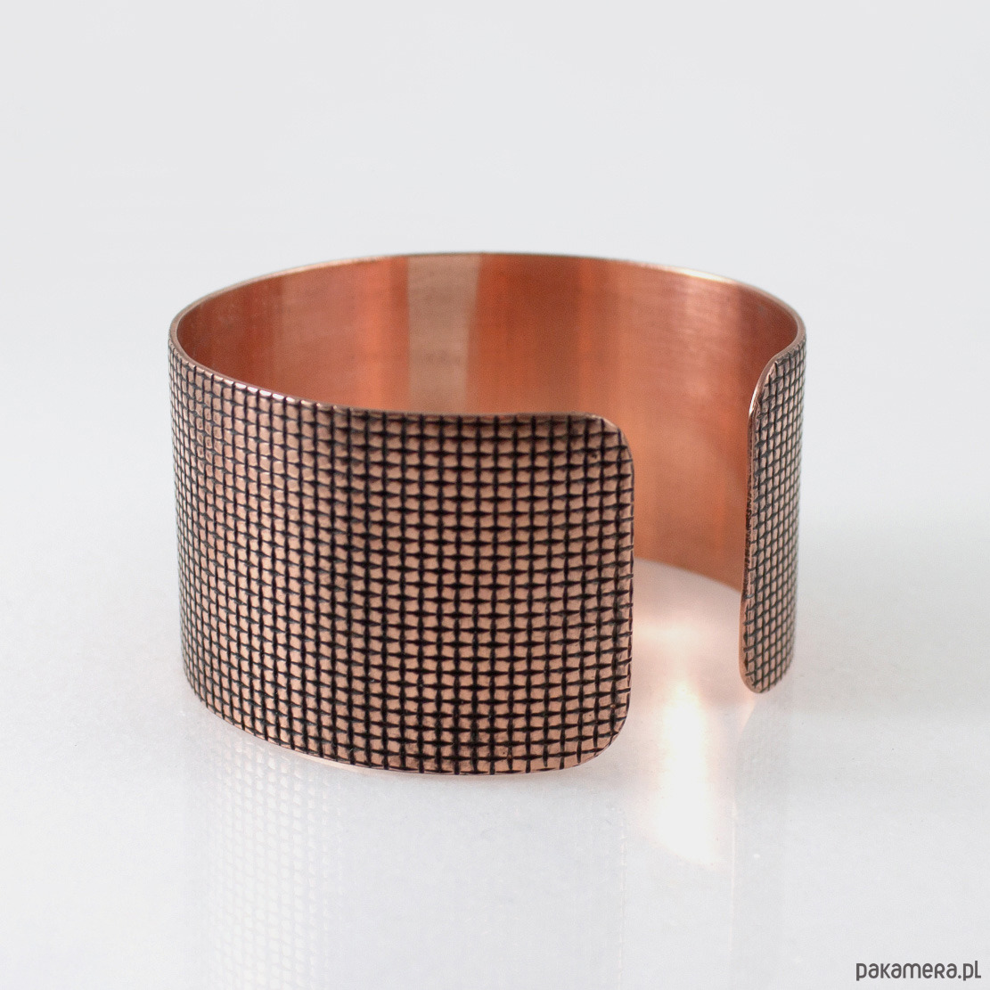 Bransoletka została wykonana w całości z miedzi, ma ok 3,5 cm szerokości. Wzór jest lekko podkreślony ciemną patyną uzyskaną w procesie oksydacji (bez użycia sztucznych barwników).