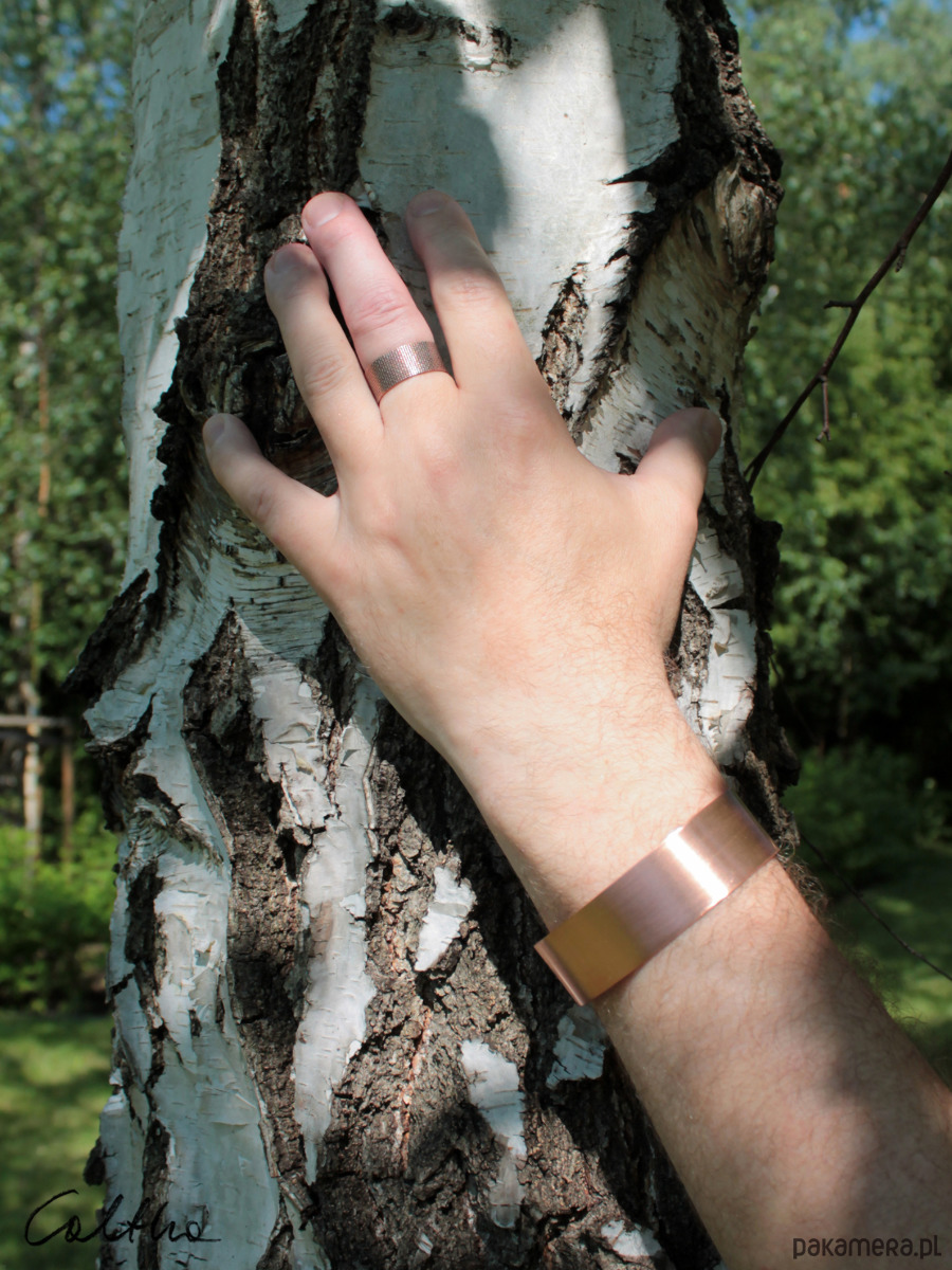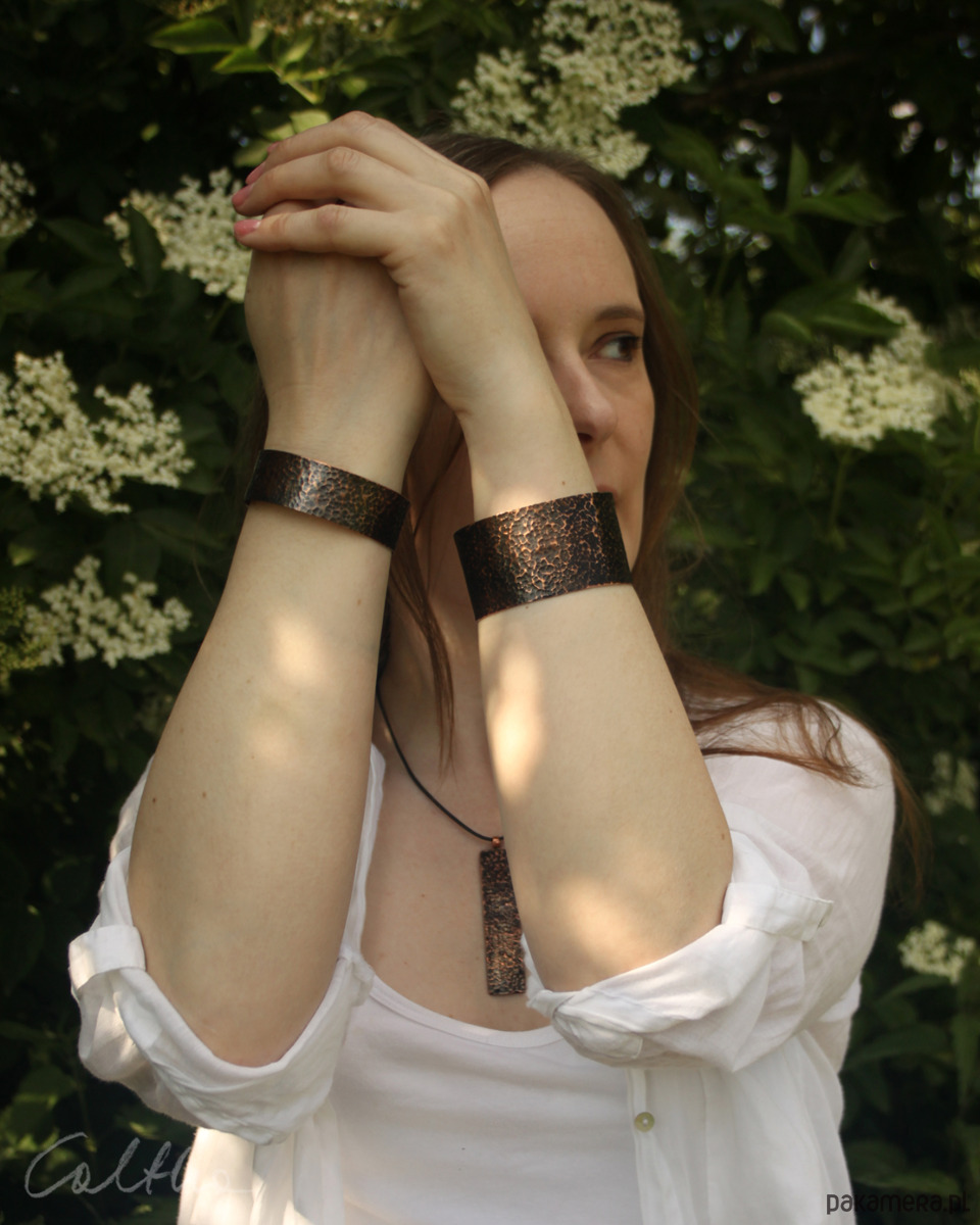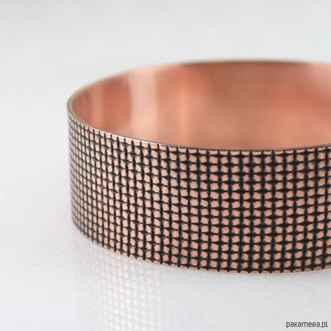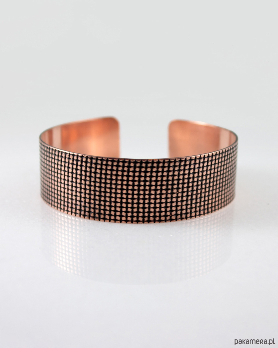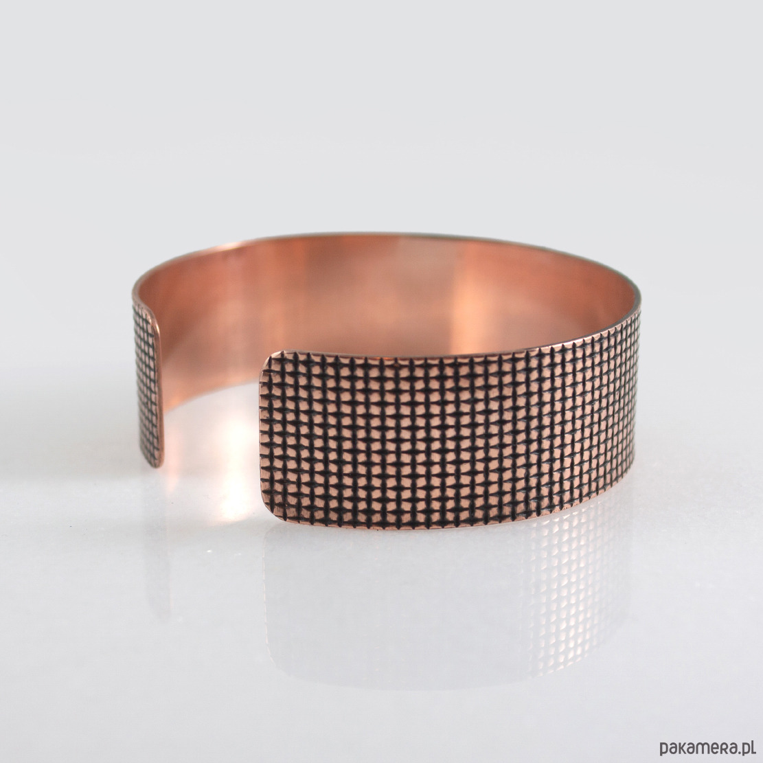 Bransoletka została wykonana w całości z miedzi, ma ok 2 cm szerokości. Wzór jest lekko podkreślony ciemną patyną uzyskaną w procesie oksydacji (bez użycia sztucznych barwników).