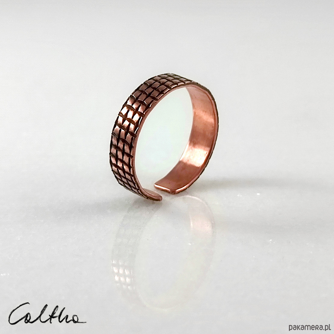 Pierścionek został wykonany z miedzi, jego szerokość to ok 0,5 cm.