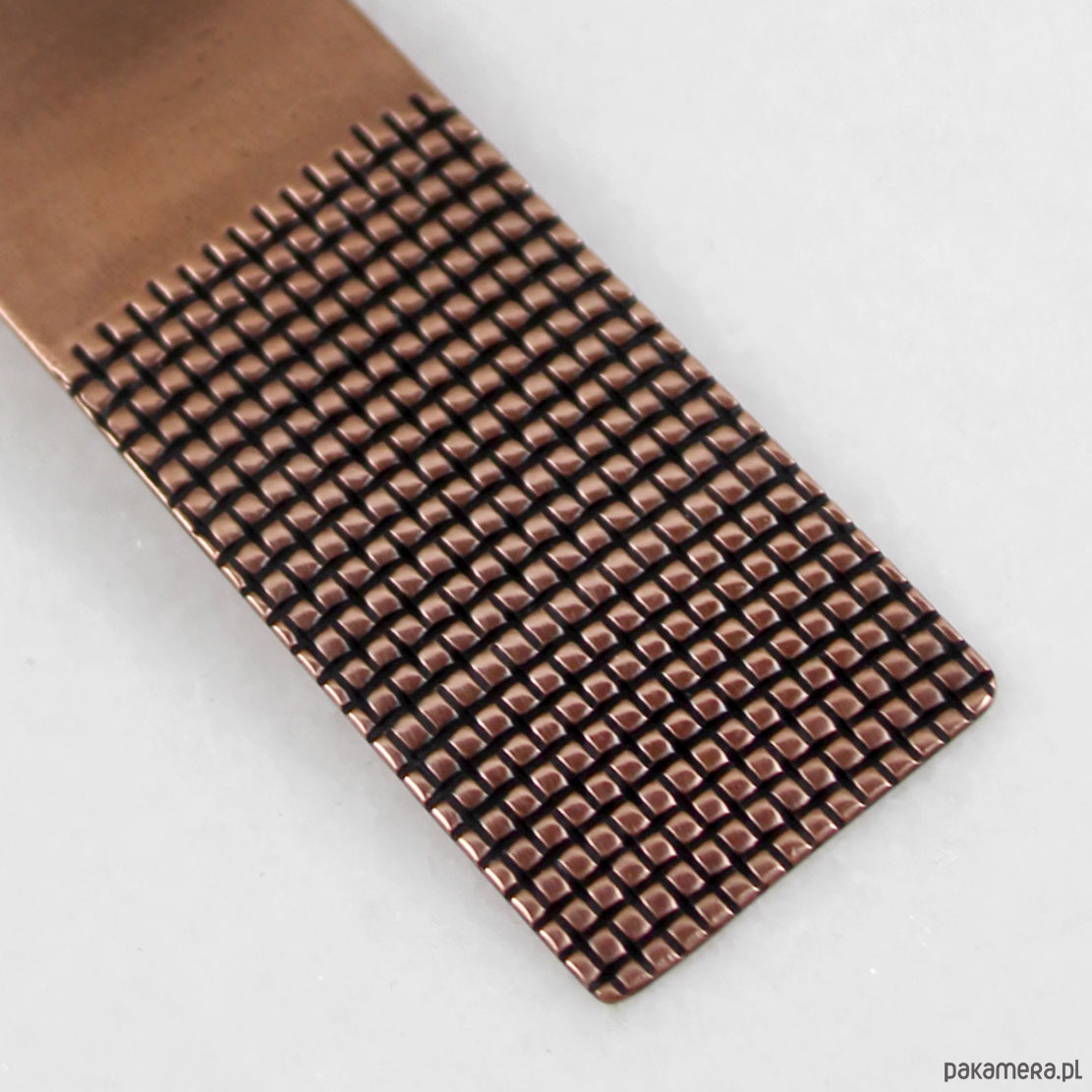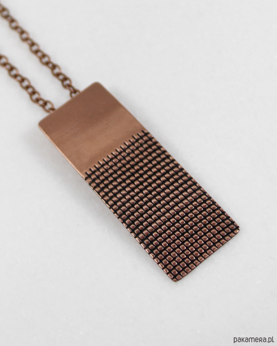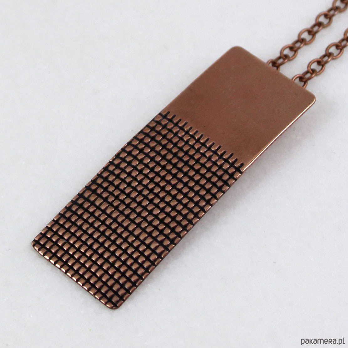 Wisior został wykonany ręcznie ze szlachetnej miedzi, ma nieregularną fakturę i jest lekko patynowany w procesie oksydacji (bez użycia sztucznych barwników). Całkowita długość wisiorka to ok 6 cm. W komplecie łańcuszek do zawieszenia.