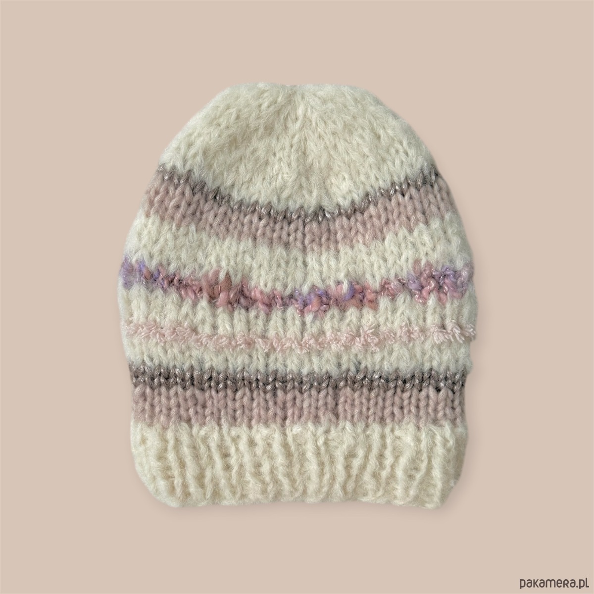 Czapka z delikatnej, miękkiej włóczki. baza to 74% alpaka 25% merino 4% poliamid. W ozdobnych paskach merino, alpaka, akryl.