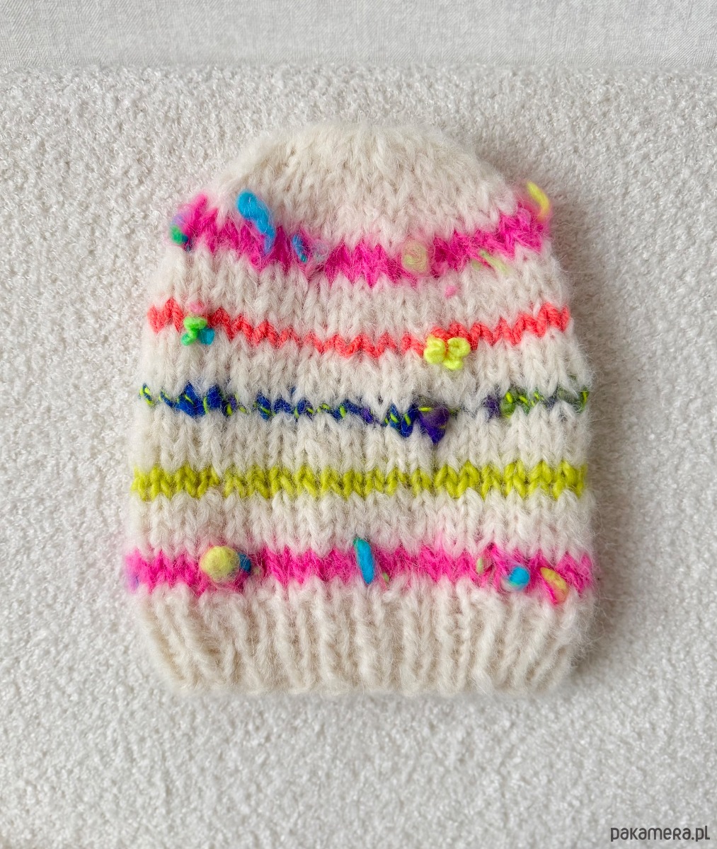 Czapka z delikatnej, miękkiej włóczki. baza to 74% alpaka 25% merino 4% poliamid. W ozdobnych paskach merino, alpaka, akryl.