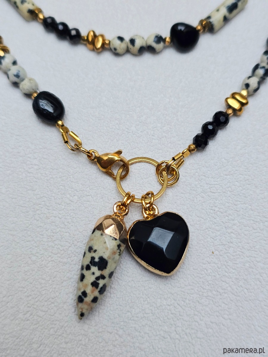 Wykorzystane kamienie to: czarny onyks, jaspis dalmatyński, złocony hematyt.