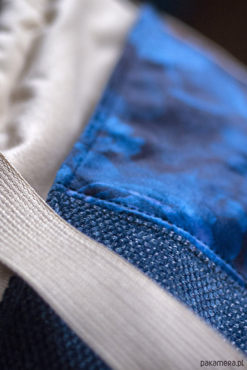 Całość ściągana grubym, bawełnianym sznurkiem w kolorze błękitnym.