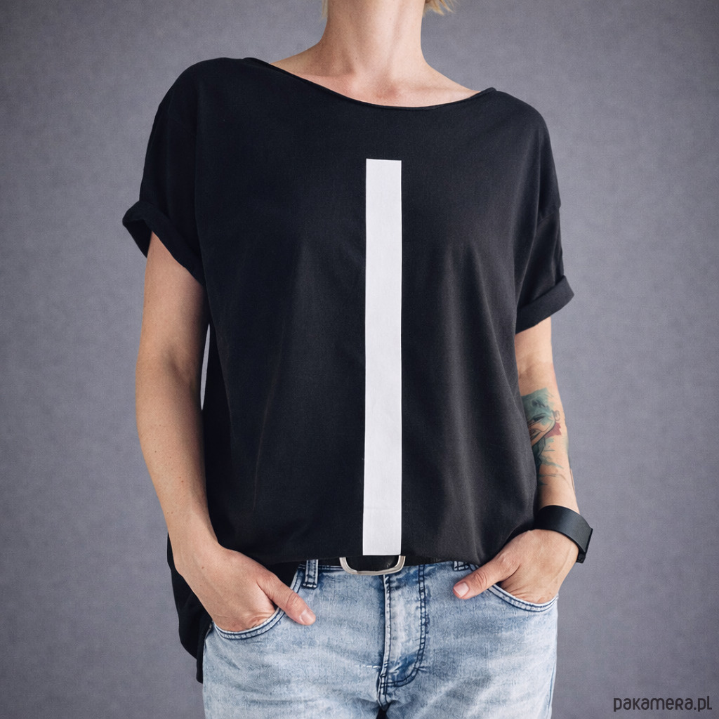 Biała kreska na czarnej koszulce. Minimalizm. Przede wszystkim.