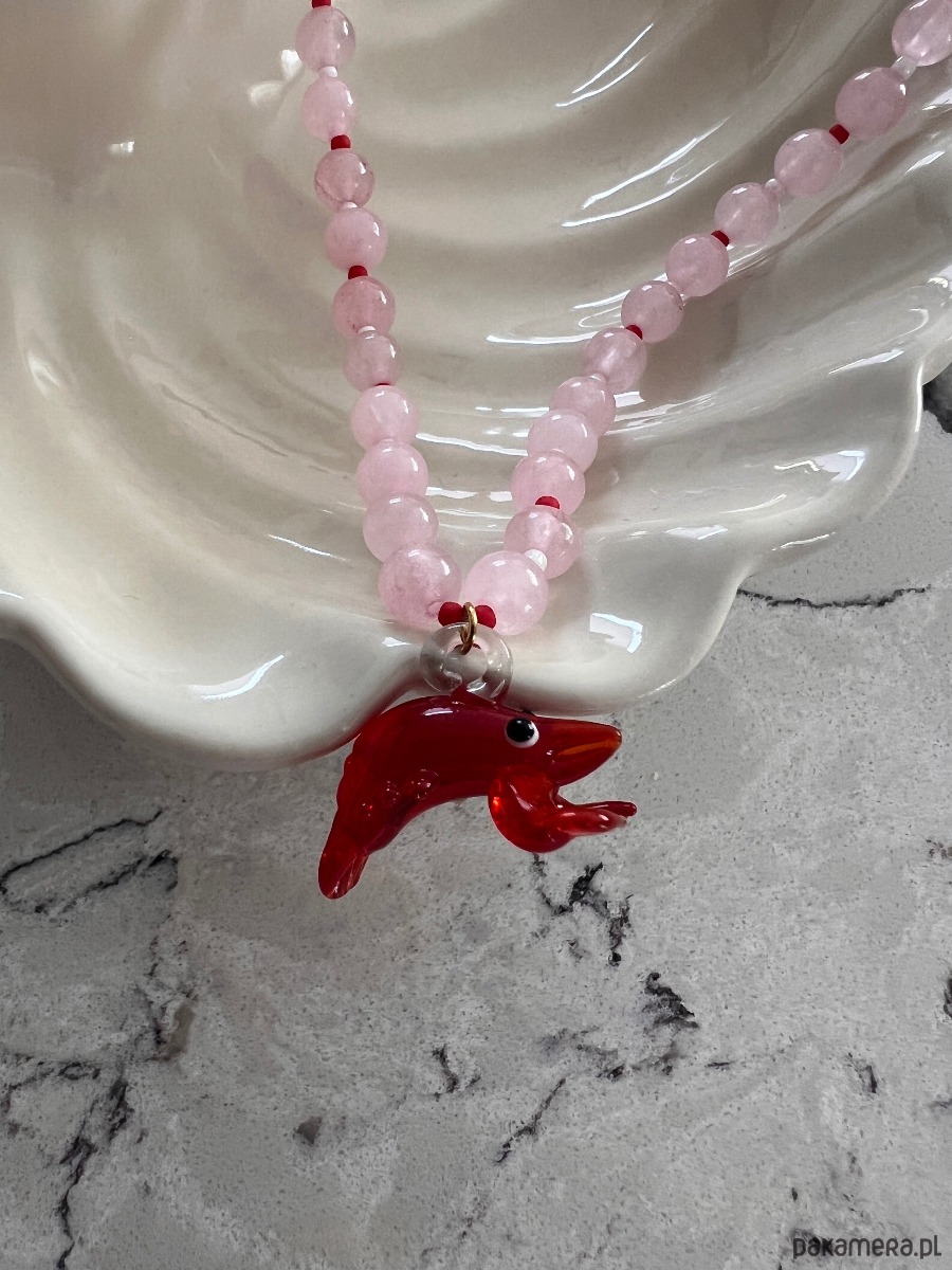 Ręcznie robiony naszyjnik ze szklanym homarem oraz różowego kwarcu, przeplatanego japońskimi koralikami toho.