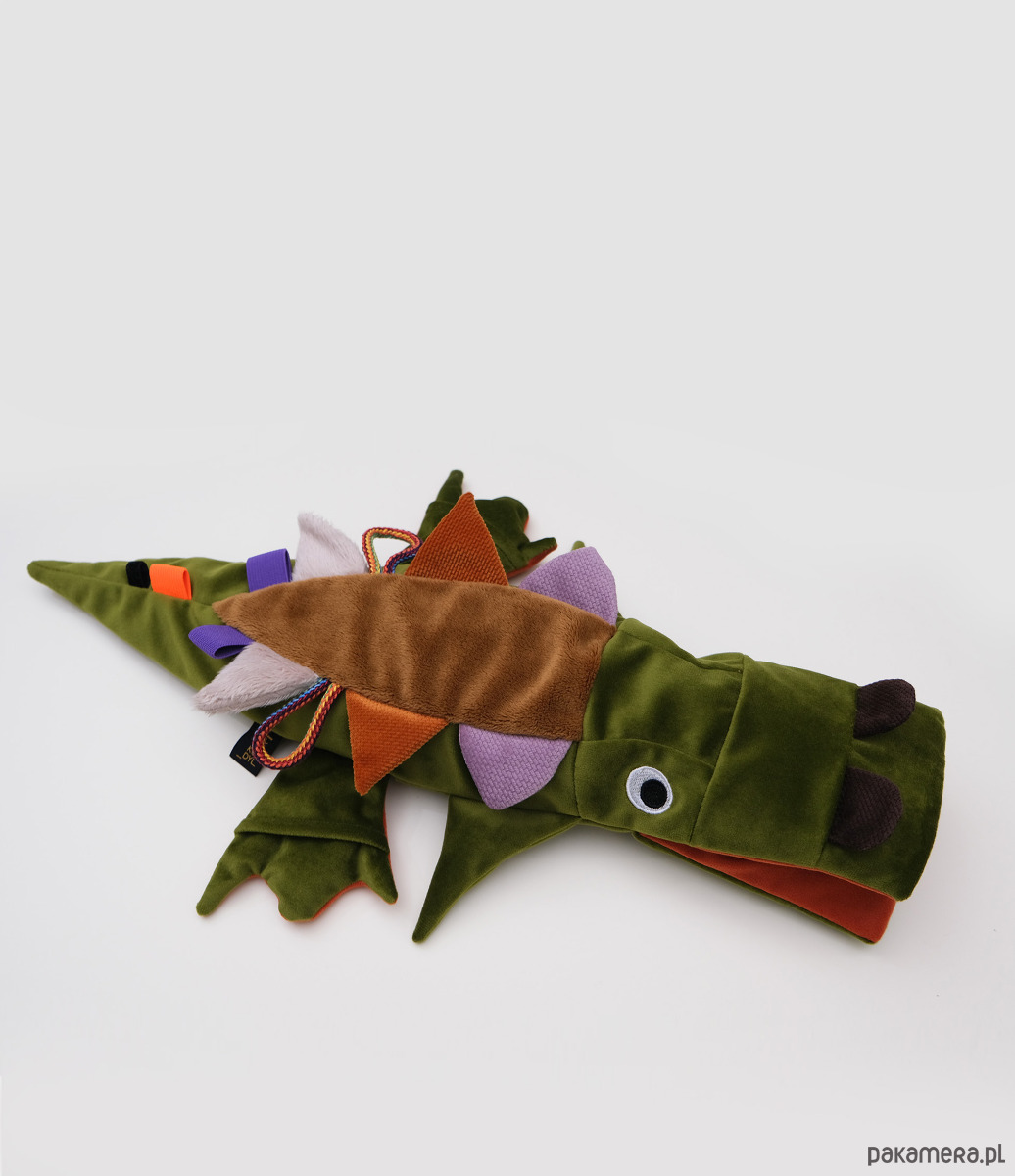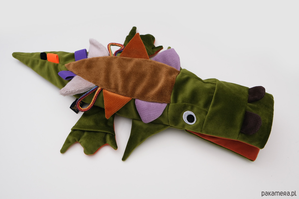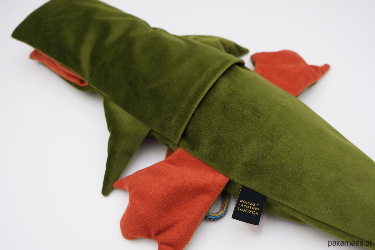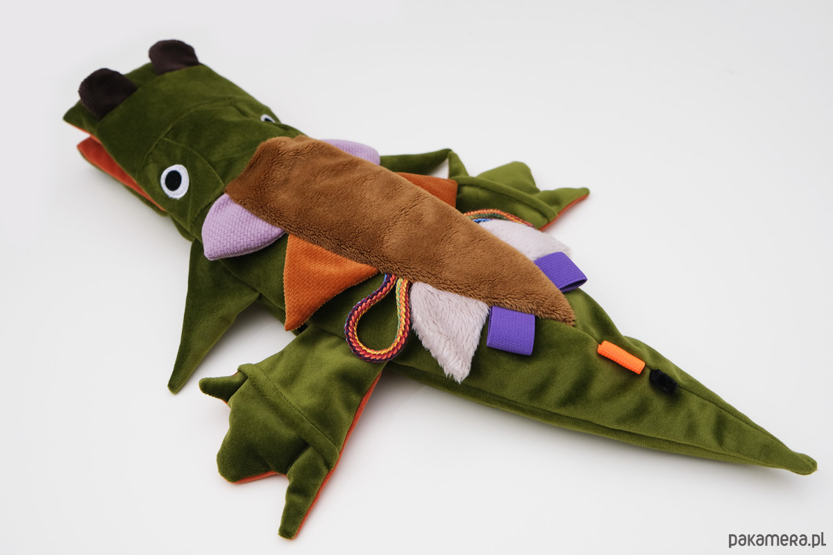 W środku zabawki znajduje się woreczek wypełniony łuską gryki, a w łapkach krokodyla umieszczone są sensoryczne kuleczki.