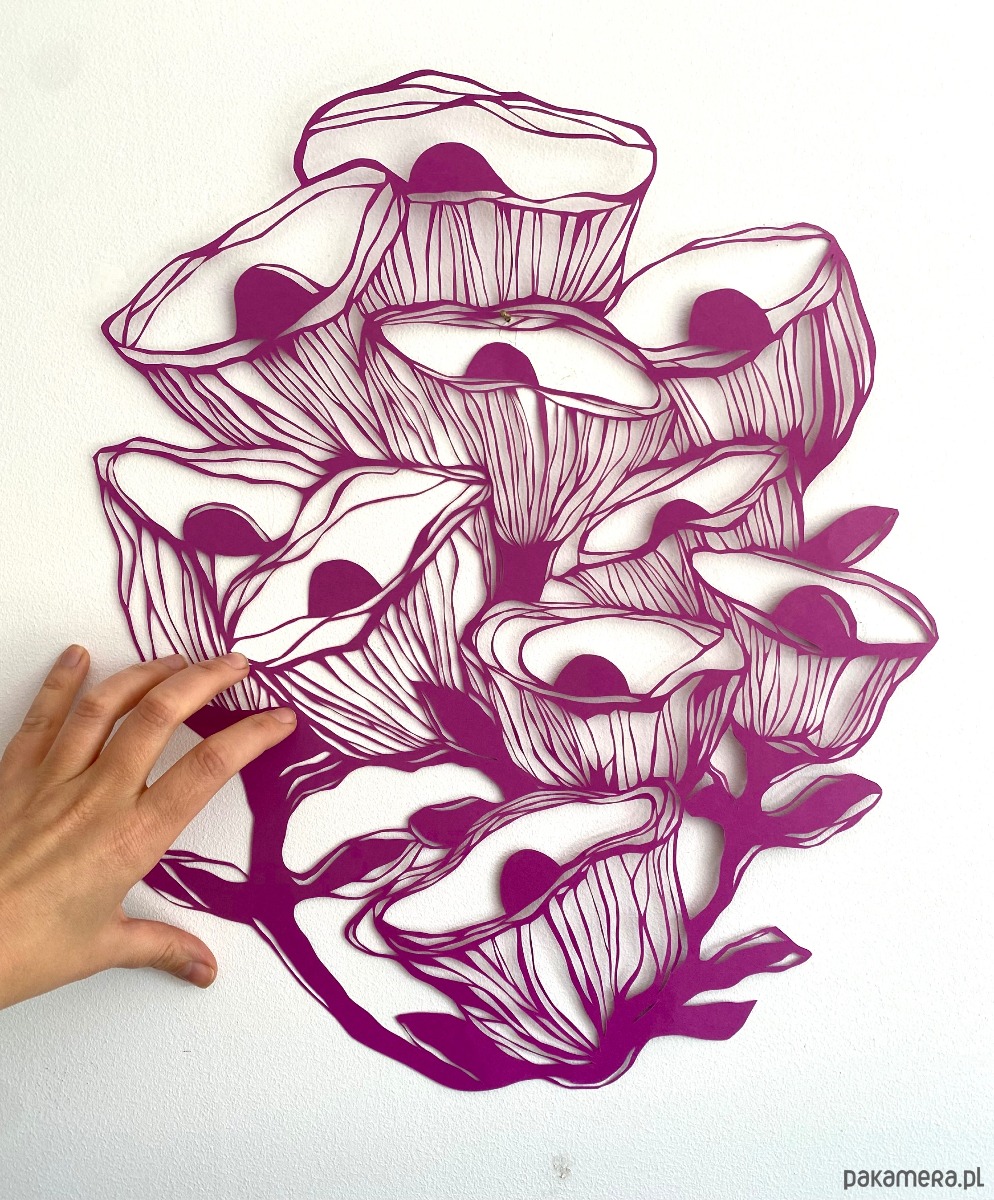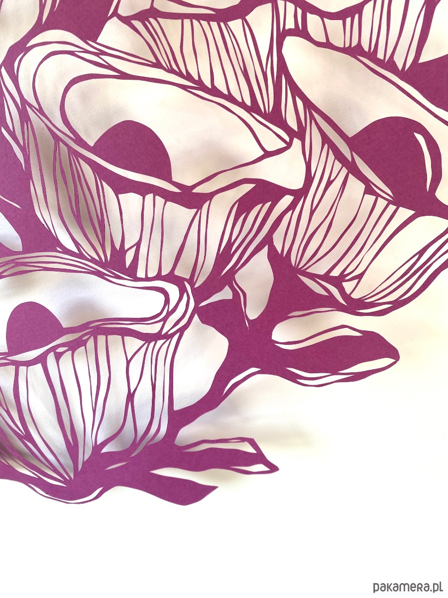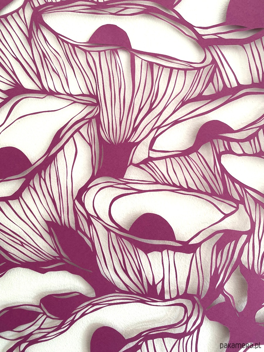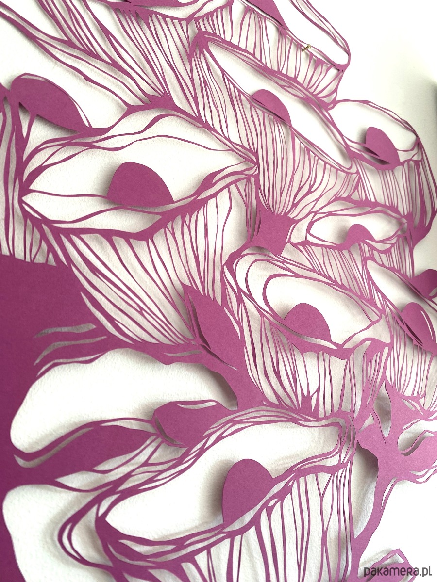 Jest to ręcznie wycinana skalpelem praca, stworzona na bazie bardzo ogólnego szkicu. Podczas pracy lubię odchodzić od pierwotnego rysunku i wycinać swobodnie, bez trzymania się początkowego planu – ta wolność daje mi energię i sprawia, że mogę z przyjemnością poświęcić wiele godzin na misterne wycinanie detali.
