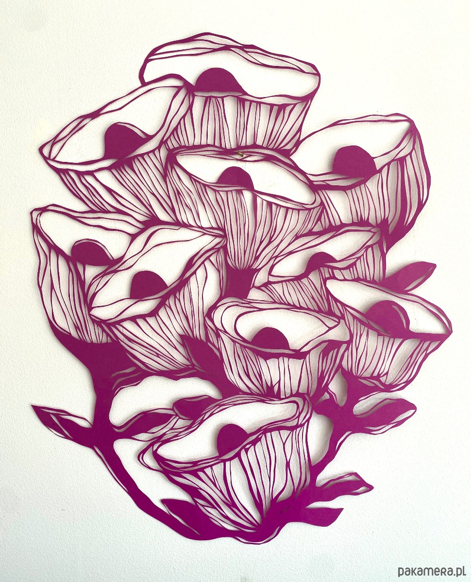 Inspirowana naturą, ręcznie wykonana praca z papieru, przedstawiająca kwiaty w abstrakcyjnej formie, przypominające krokusy, tulipany lub grzyby.