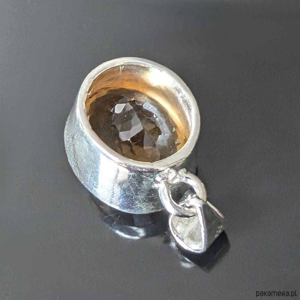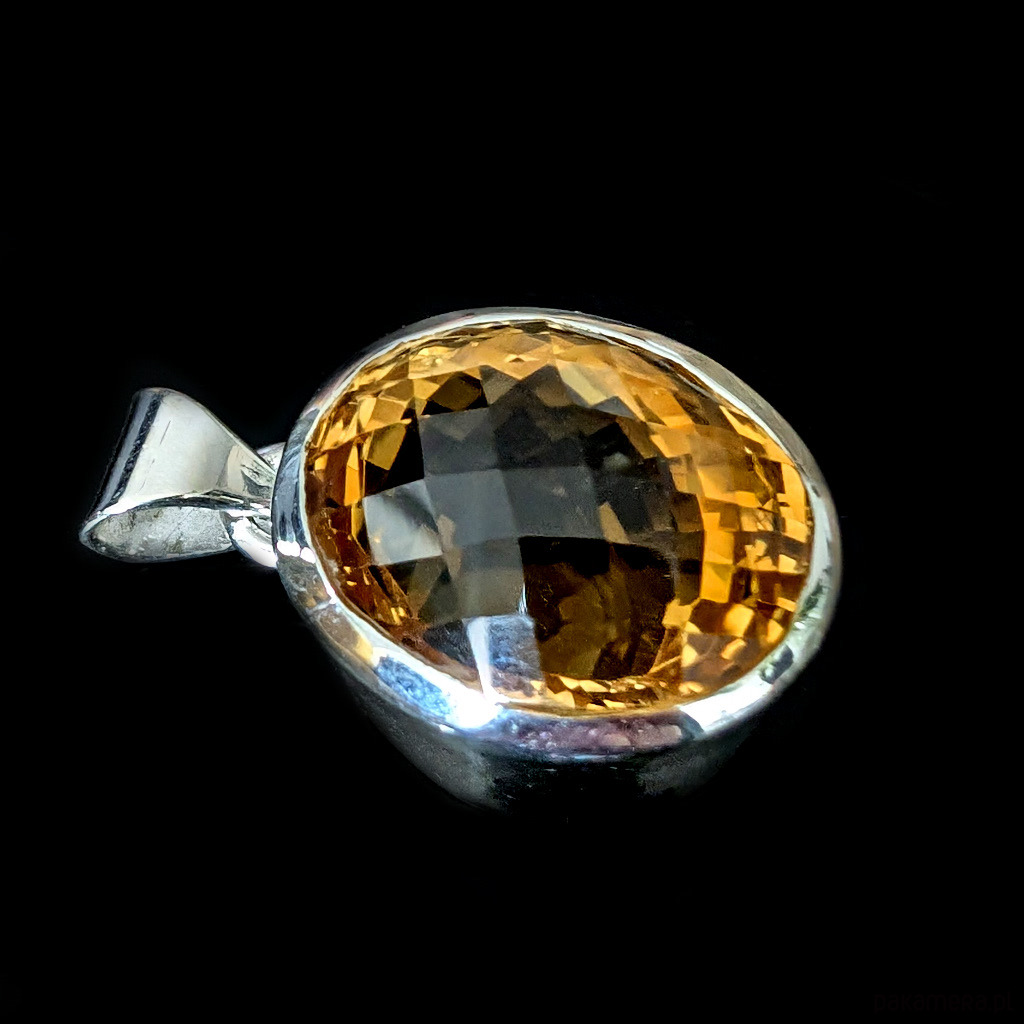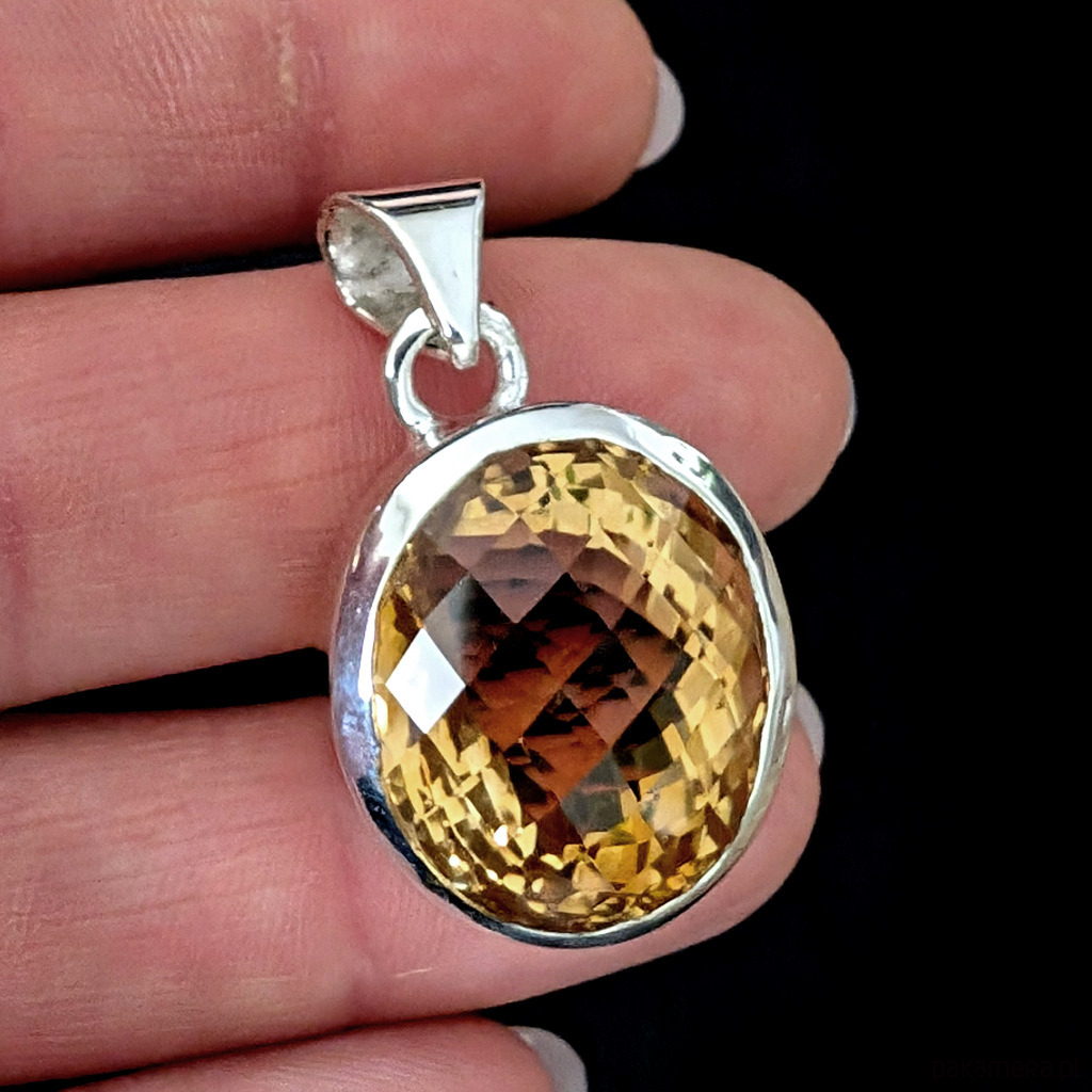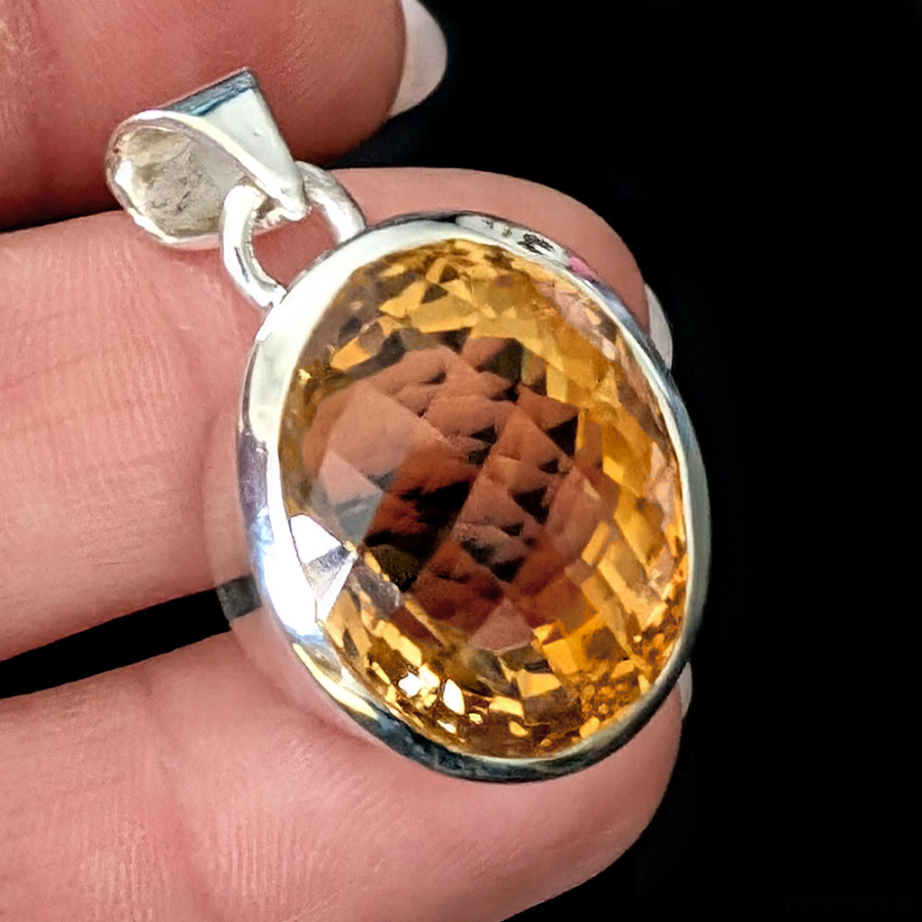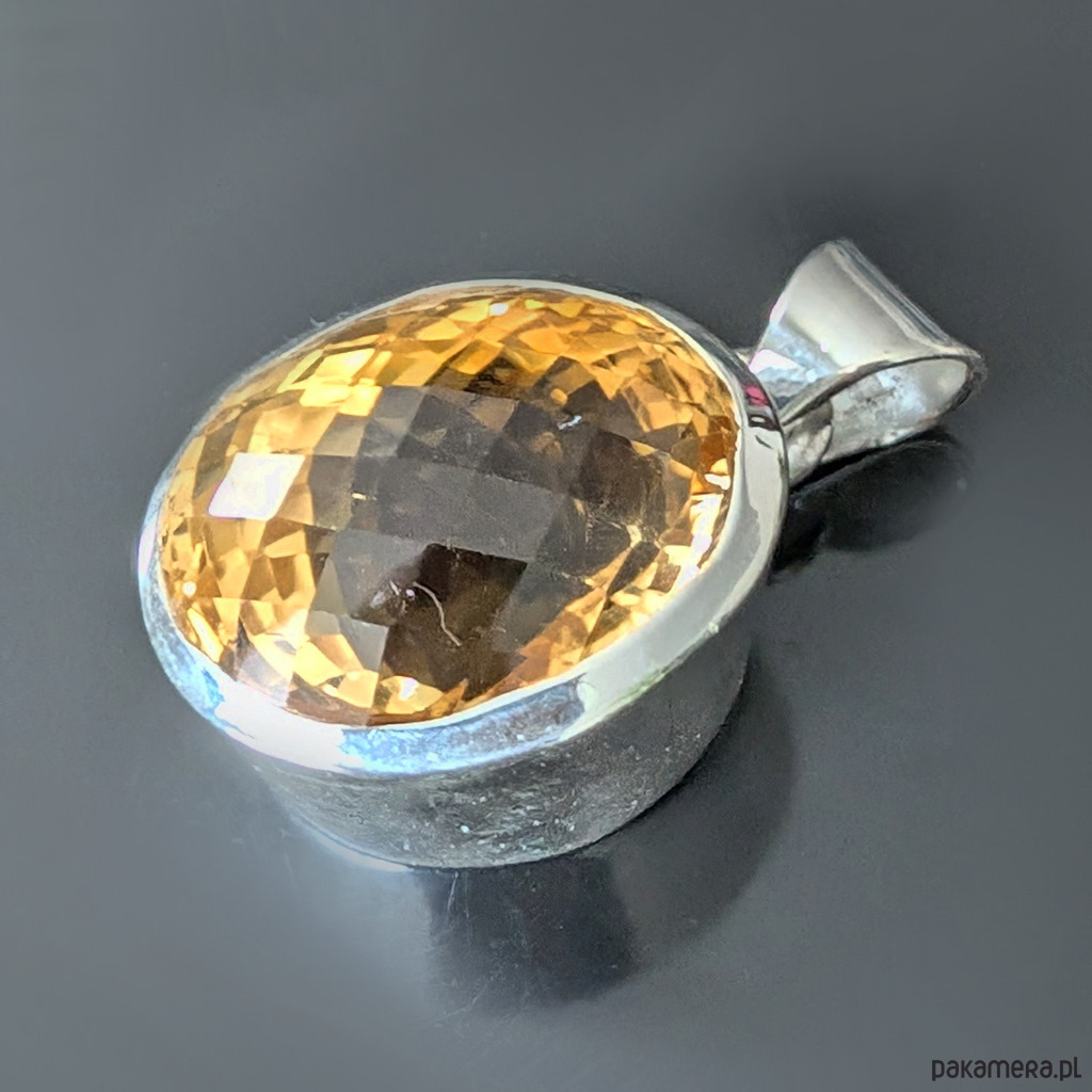 Wisior wykonany ze srebra 925 oraz pięknego cytynu o precyzyjnym szlifie na całej powierzchni. Wymiary oprawy kamienia 21 x 19 mm. Długość 31 mm. Waga wisiorka 15,3 g. Wykonany przez dostacę kamieni. Zapakowanyw ozdobne pudełeczko.