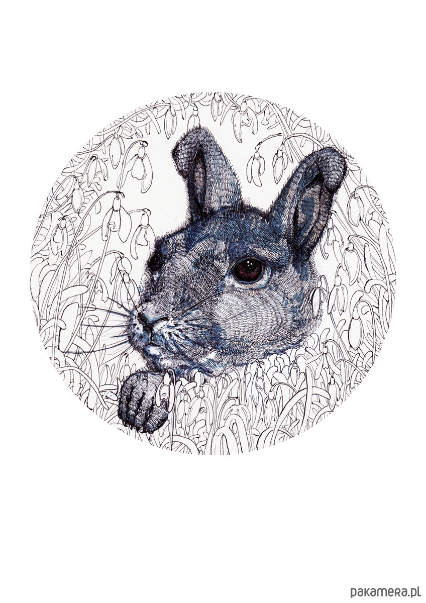 Królik i śnieżyczki, wydruk autorskiej ilustracji inspirowanej światem rodzimej fauny oraz estetyką vintage
