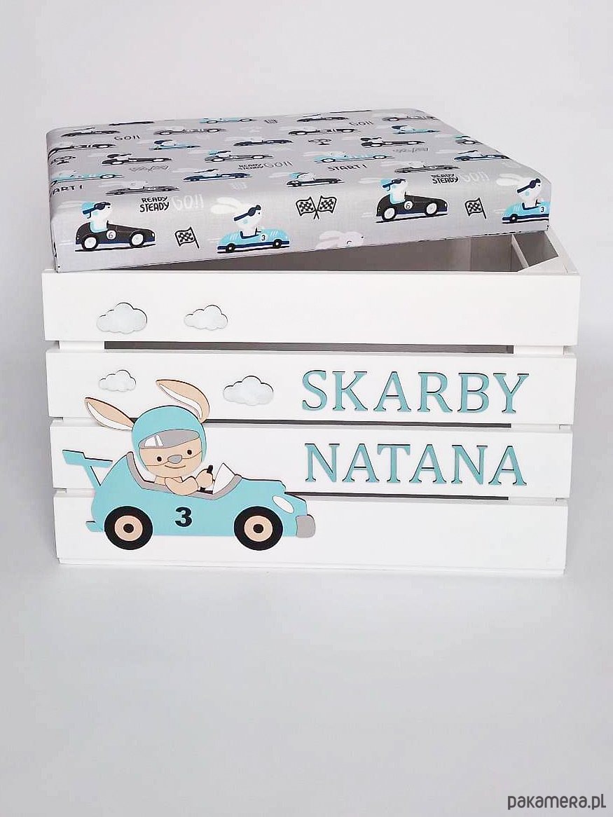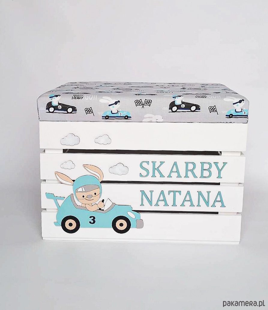 KROLIK W RAJDÓWCE Skrzynia pudełko na zabawki z imieniem dla chłopca