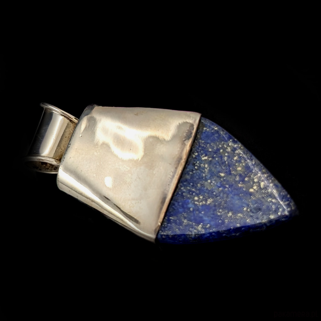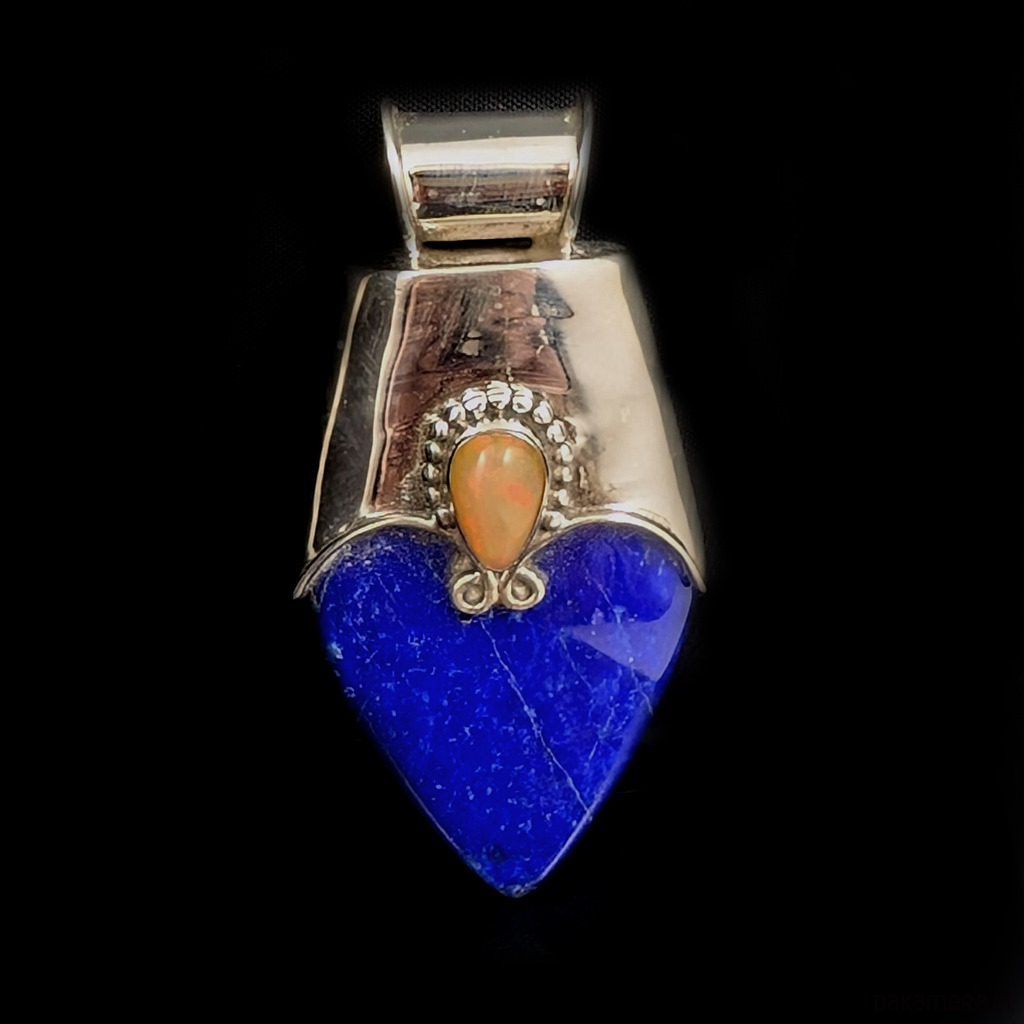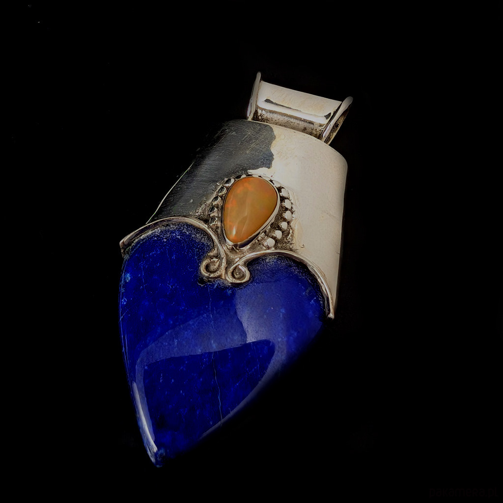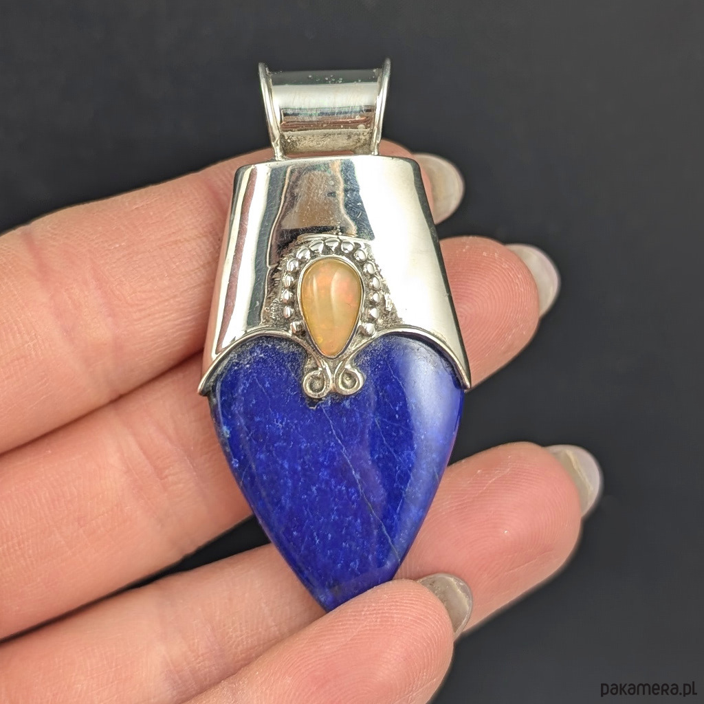 Oryginalny wisior wykonany ze srebra próby 925 oraz okazałego lapisu lazuli. Koronę wisiora wieńczy opal z Etiopii. Wymiary całego wisiora 56 x 28 mm, oprawa opalu 9 x 6 mm. Wisior waży 18,8 grama. Wisior zostanie zapakowany w ozdobne pudełeczko. Wykonany przez dostawcę kamieni.