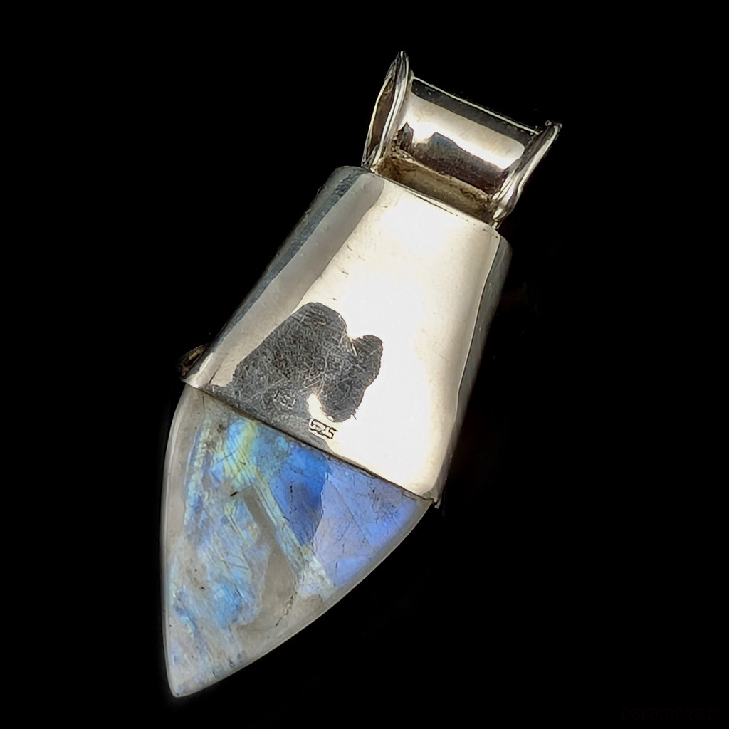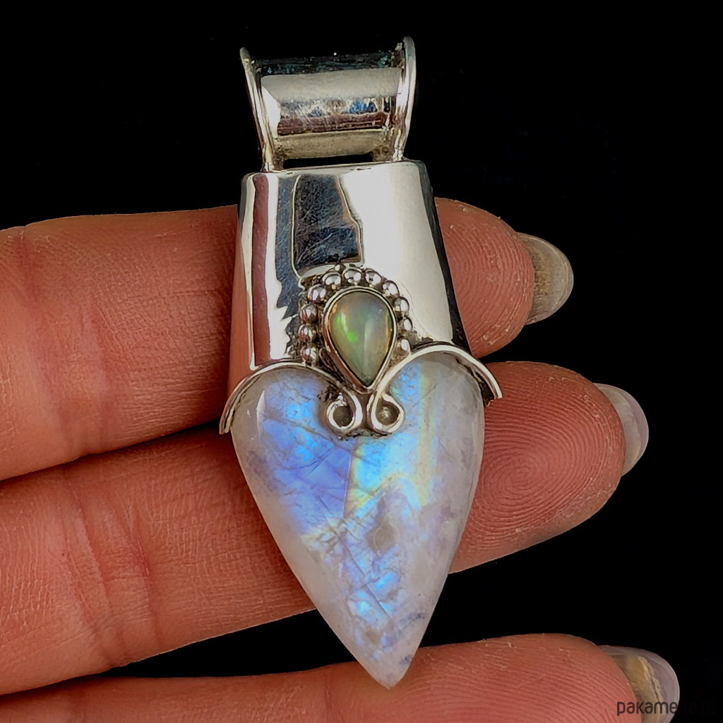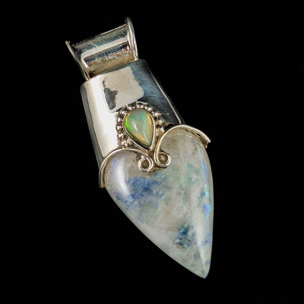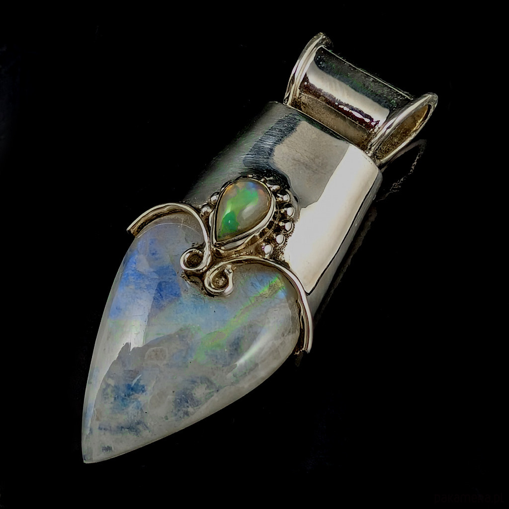 Oryginalny wisior wykonany ze srebra próby 925 oraz przepięknego okazu kamienia księżycowego. Koronę wisiora wienczy opal z Etiopii. Wymiary całego wisiora 50 x 22mm, oprawa opalu 7 x 5 mm. Wisior waży 12,5 grama. Wisior zostanie zapakowany w ozdobne pudełeczko. Wykonany przez dostawcę kamieni.