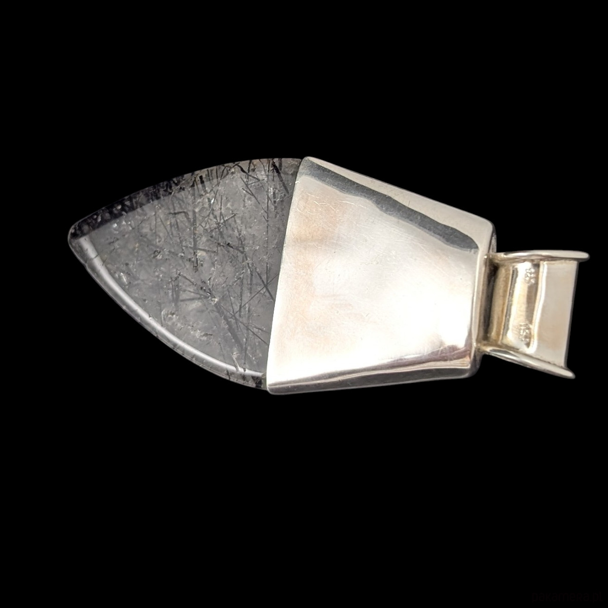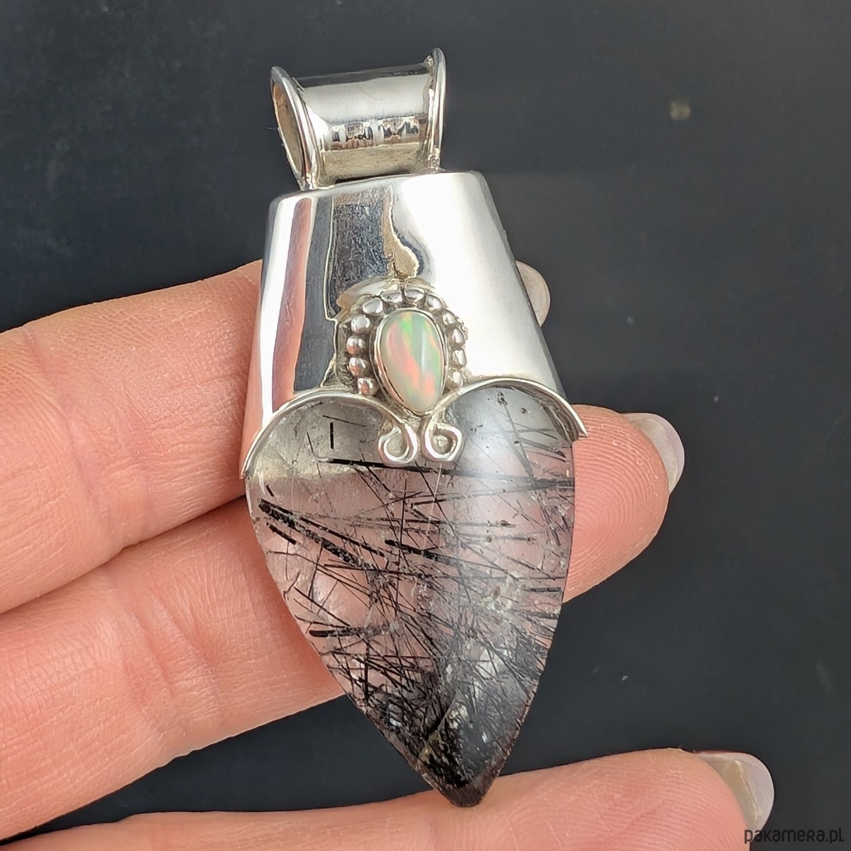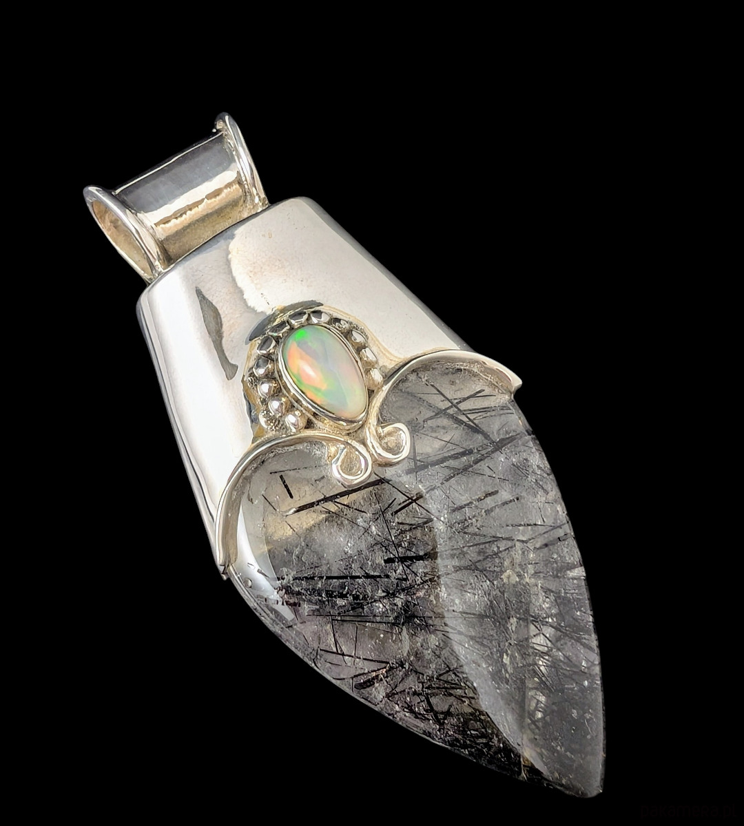 Oryginalny wisior wykonany ze srebra próby 925 oraz pięknego kwarcu z inkluzjami czarnego turmalinu. Koronę wisiora wienczy opal z Etiopii. Wymiary całego wisiora 54 x 26 mm, oprawa opalu 9 x 6 mm. Wisior waży 16 g. Wisior zostanie zapakowany w ozdobne pudełeczko. Wykonany przez dostawcę kamieni.