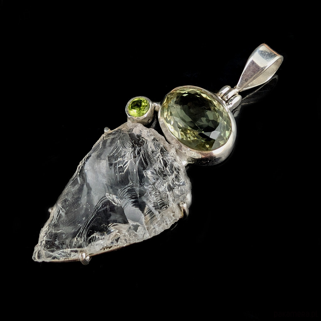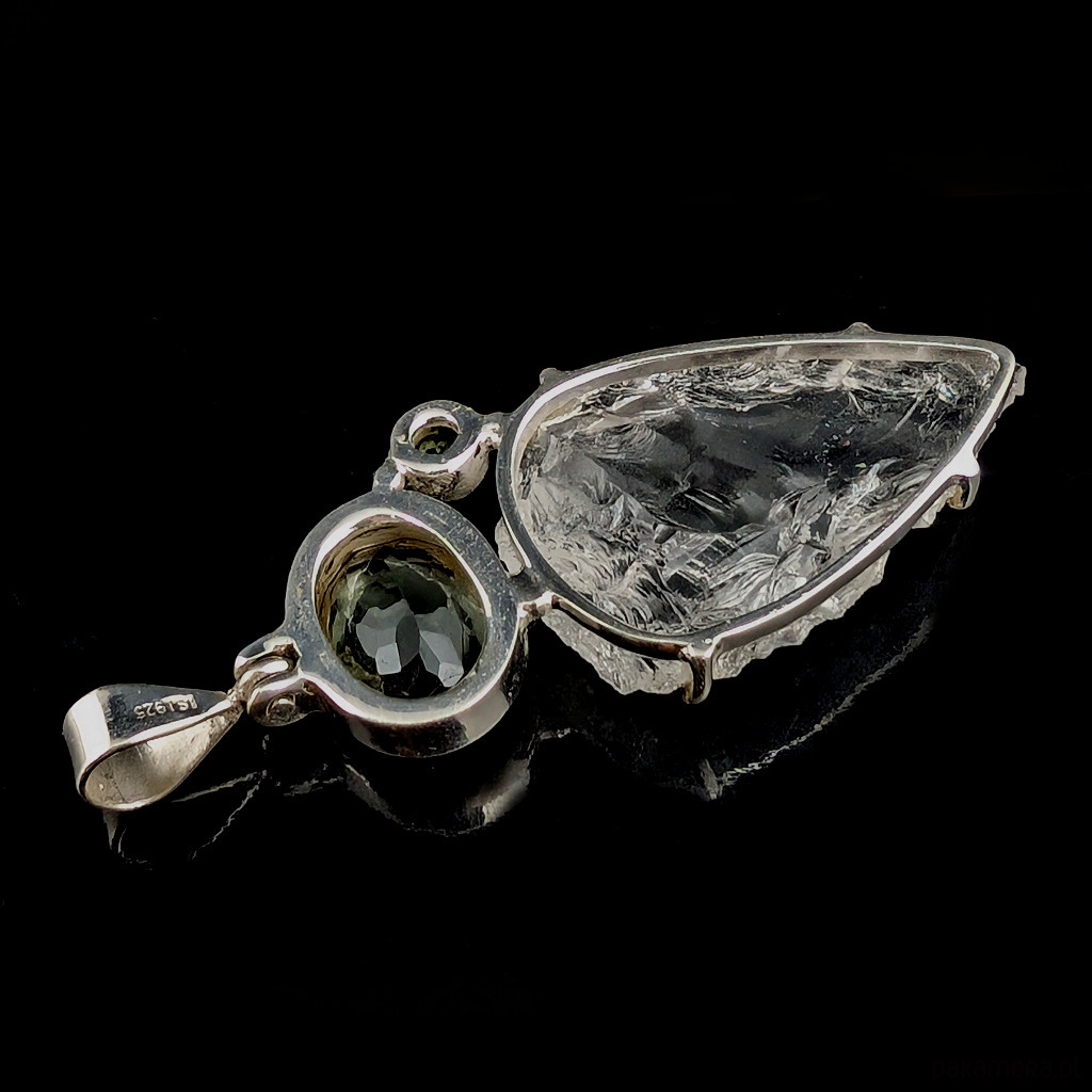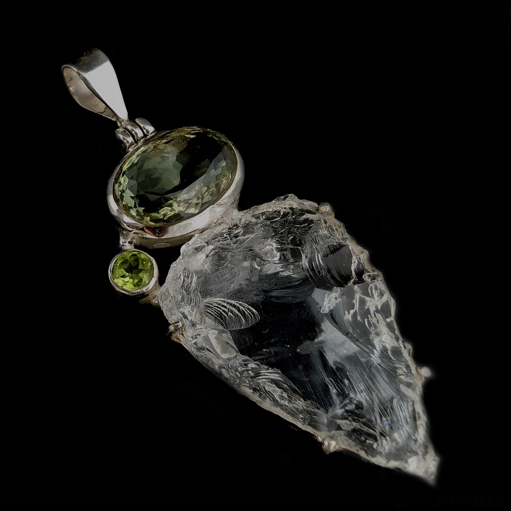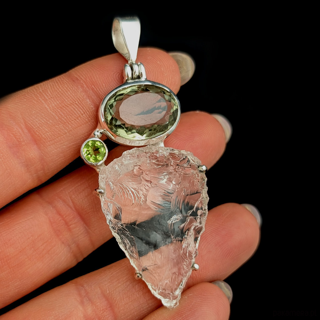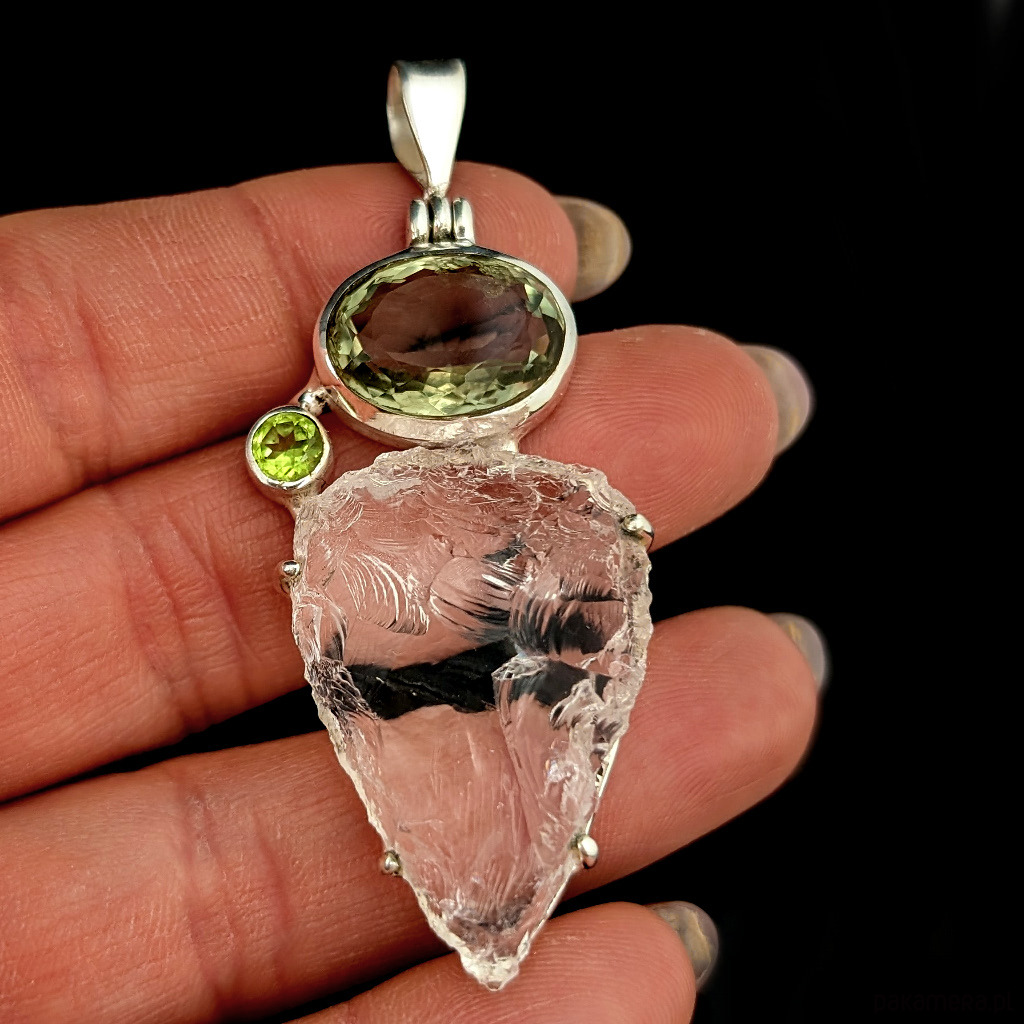Wisior z kryształem kwarcu zwanym górskim o nieskazitelnej czystości. Niezwykłe, ultraczyste lustro minerału w surowej tafli. Kryształ oprawiony w srebro pr.925. Towarzyszy mu fasetowany zielony ametyst oraz peridot. Wymiary całej kompozycji 53 x 32 mm. Długość z krawatką 64 mm. Waga 15,5 grama. Otwarty tył wisiora ukazuje niezwykłe piękno kamieni w pełnej krasie. Wykonany przez dostawcę kamieni. Wisior zapakowany w ozdobne pudełeczko.