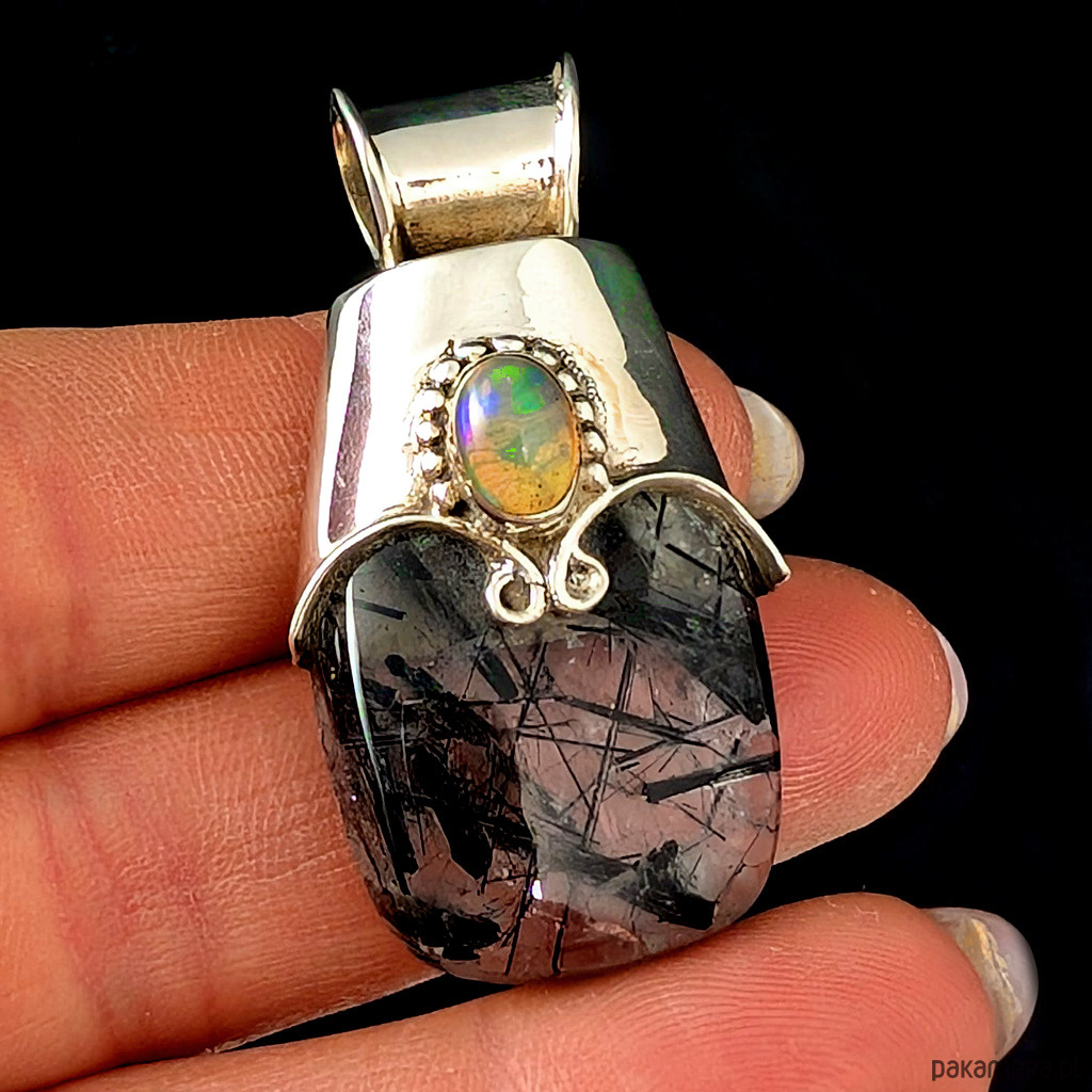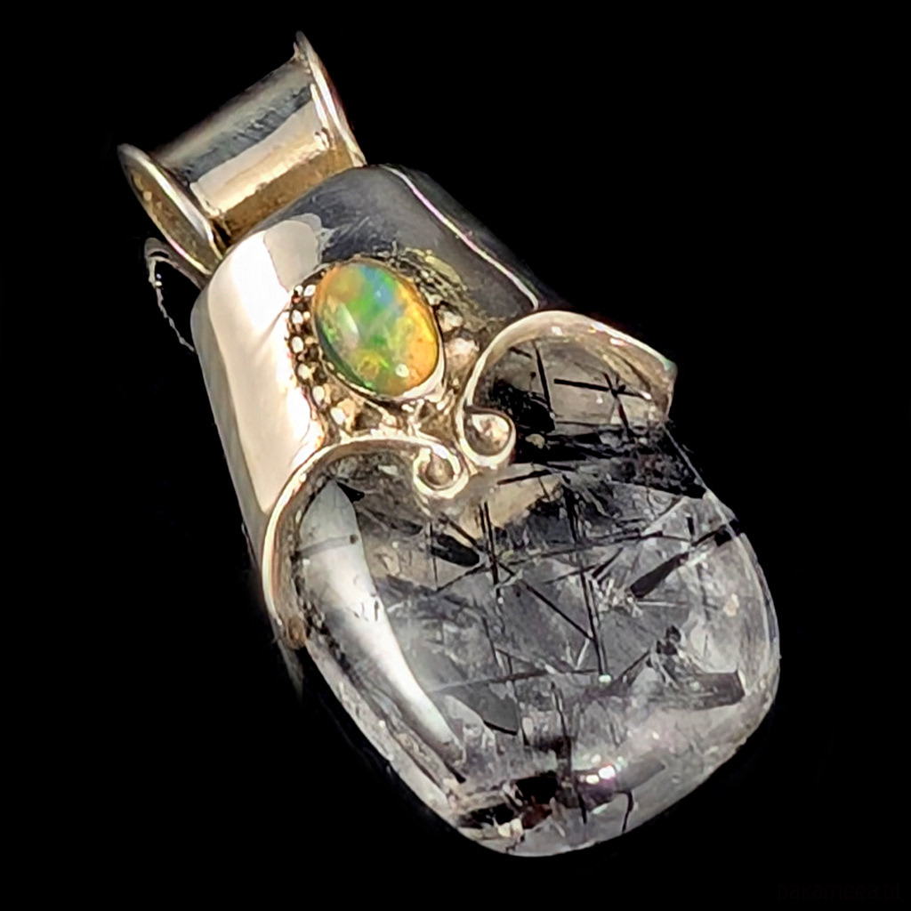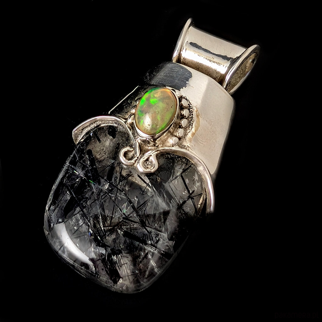 Oryginalny wisior wykonany ze srebra próby 925 oraz pięknego kwarcu z inkluzjami czarnego turmalinu. Koronę wisiora wienczy opal z Etiopii. Wymiary całego wisiora 45 x 24 mm, oprawa opalu 9 x 7 mm. Wisior waży 15 g. Wisior zostanie zapakowany w ozdobne pudełeczko. Wykonany przez dostawcę kamieni.