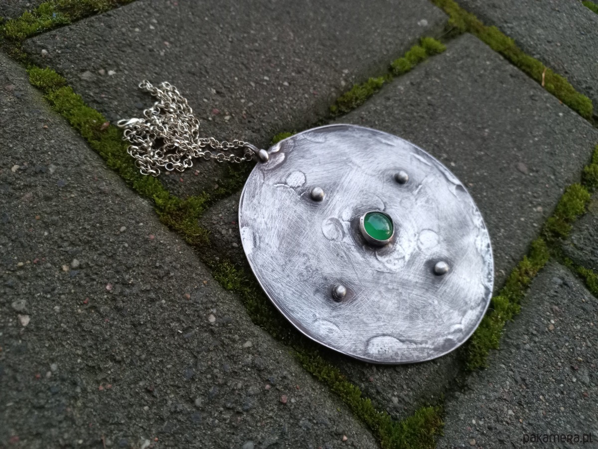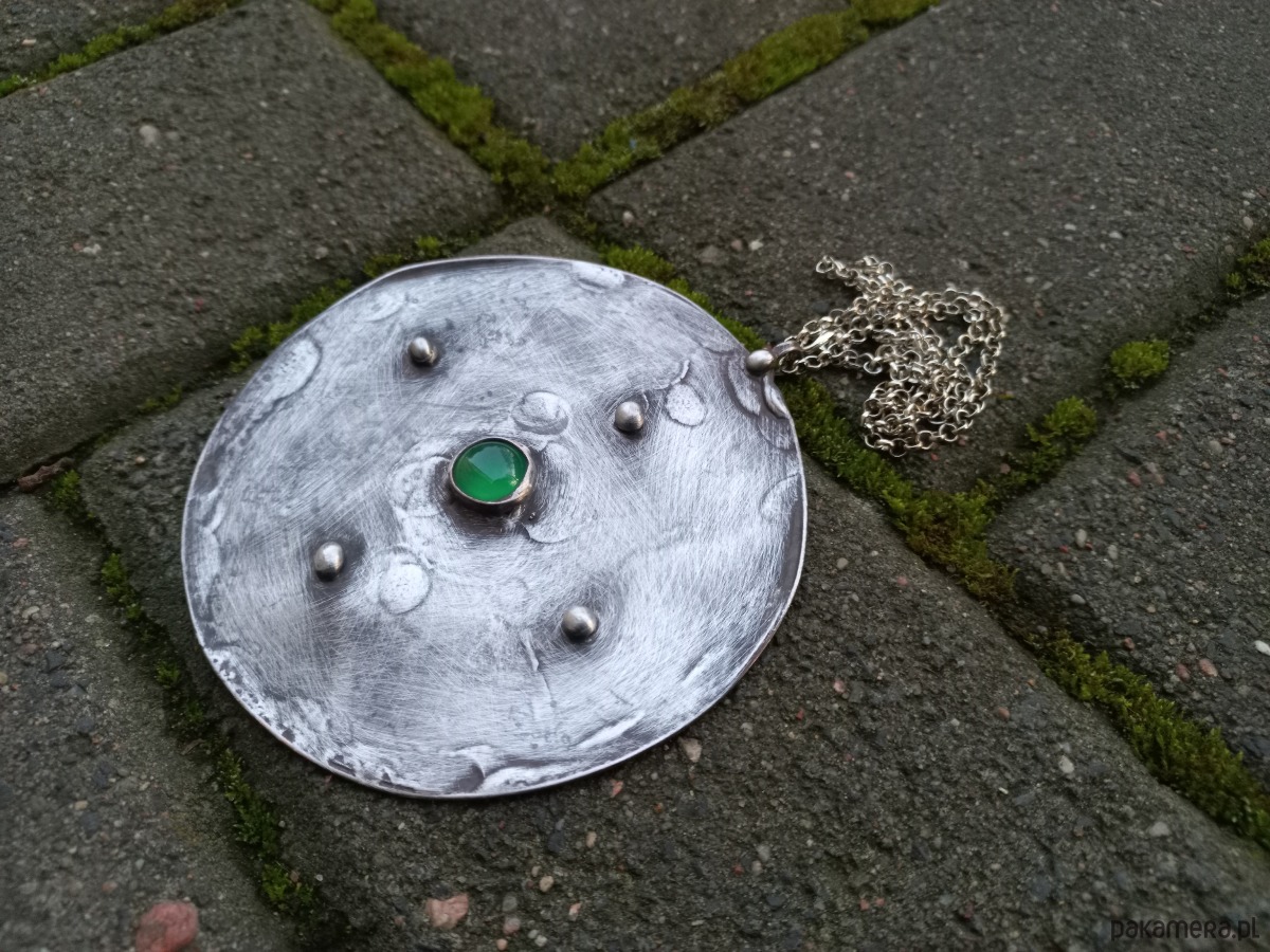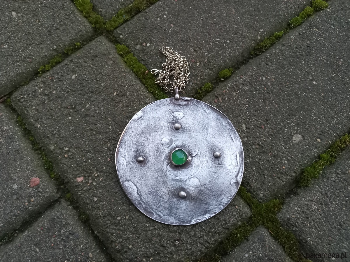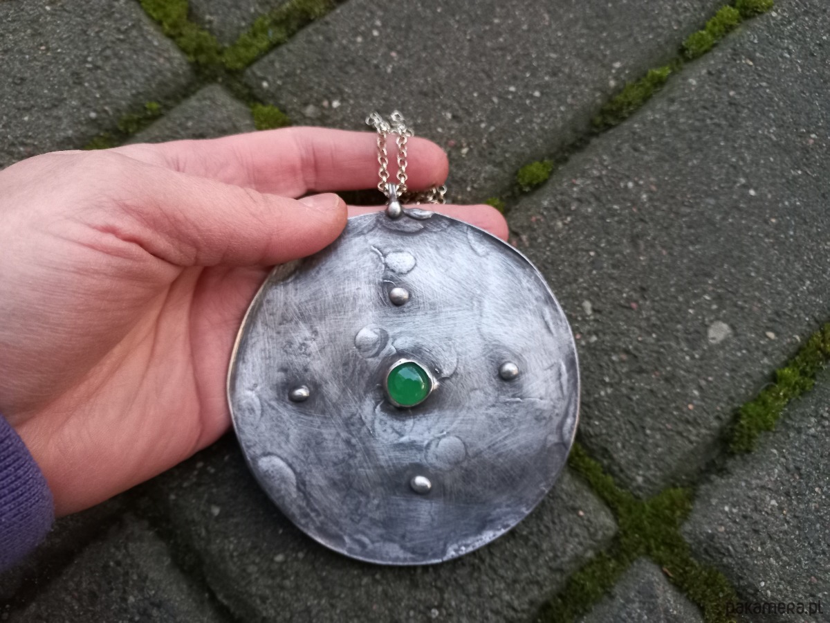 Wisiorek wykonany z miedzi, cyny i agatu. Wymiary ok. 9,5 na 9,5 cm. Zawieszony na łańcuszku o długości ok. 50 cm.