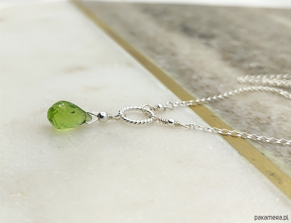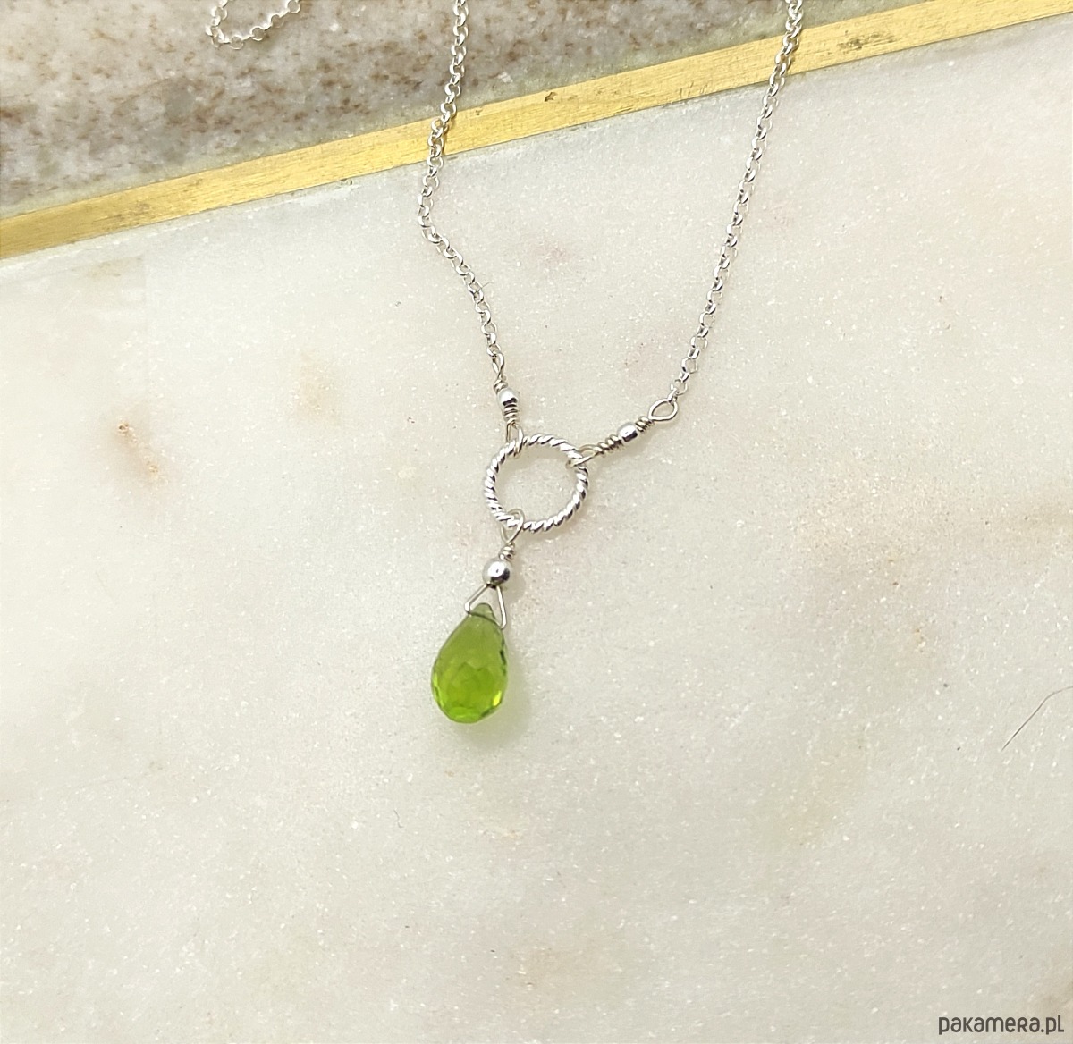 Na delikatnym łańcuszku zawieszony został kamień w kształcie kropli. Zamocowany na kółeczku kamyk jest precyzyjnie szlifowany, dzięki czemu z każdej strony wygląda idealnie. Kumuluje w sobie światło, które blaskiem zdobi dekolt.