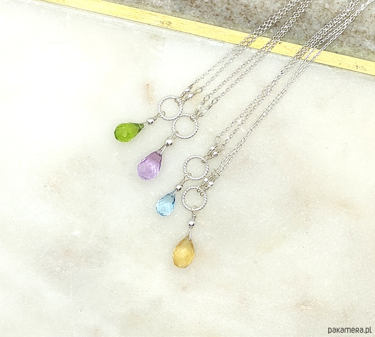 Kamień o długości 9-11 mm, fasetowany, transparentny. Wszystkie kamienie są naturalne, mogą nieznacznie różnić się rozmiarem i kształtem. Możliwe różnice widoczne są na zdjęciu z czterema naszyjnikami w dostępnych kolorach.
