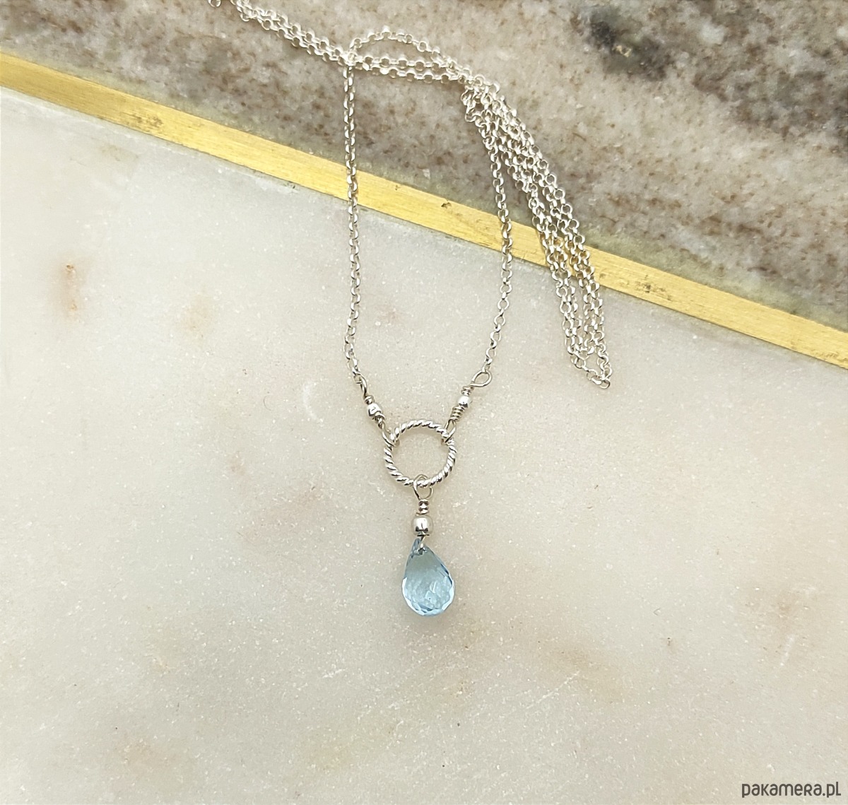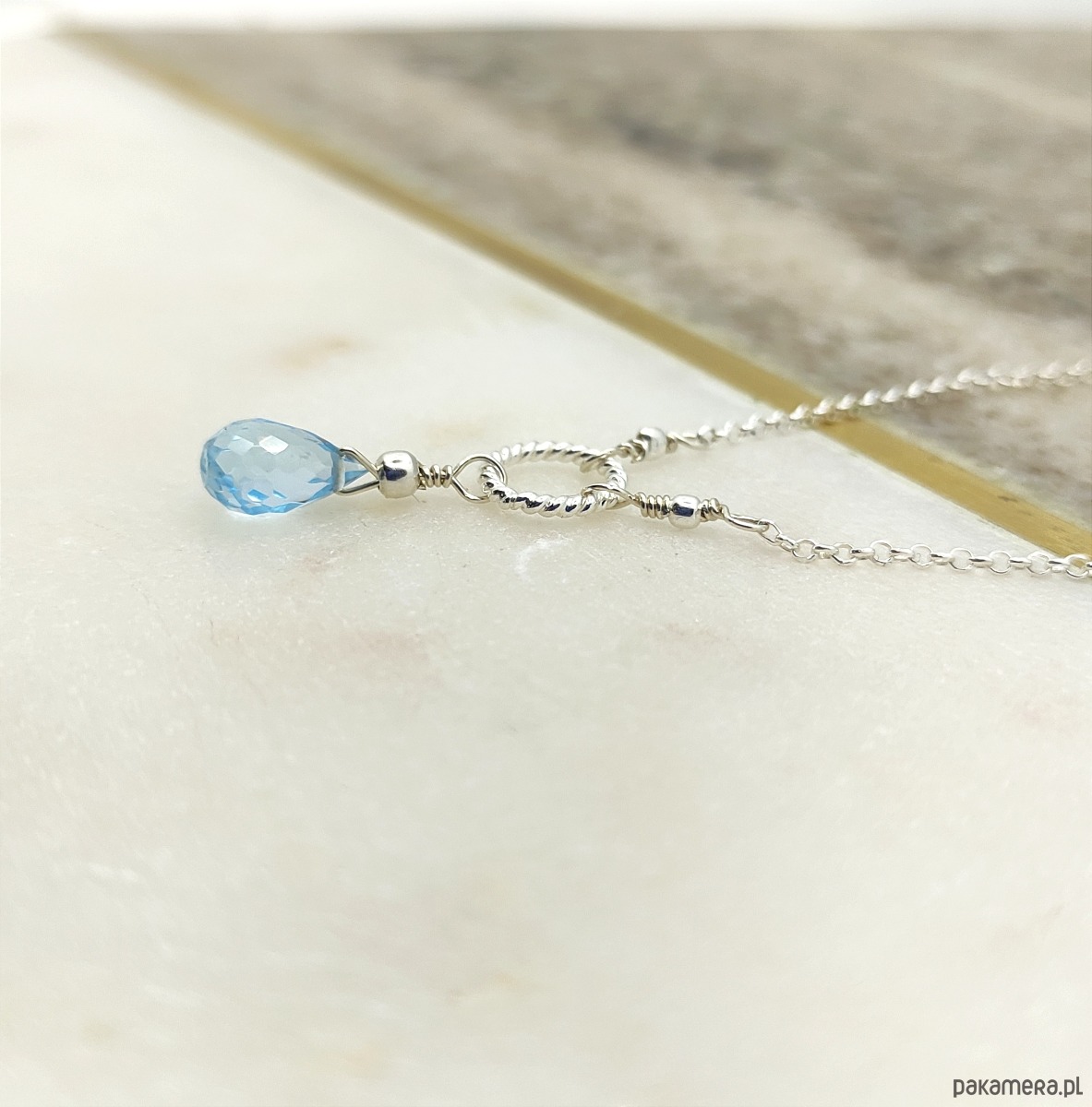 Na delikatnym łańcuszku zawieszony został kamień w kształcie kropli. Zamocowany na kółeczku kamyk jest precyzyjnie szlifowany, dzięki czemu z każdej strony wygląda idealnie. Kumuluje w sobie światło, które blaskiem zdobi dekolt. Piękny błękit, w odcieniu swiss blue, który pasuje do każdego typu urody.