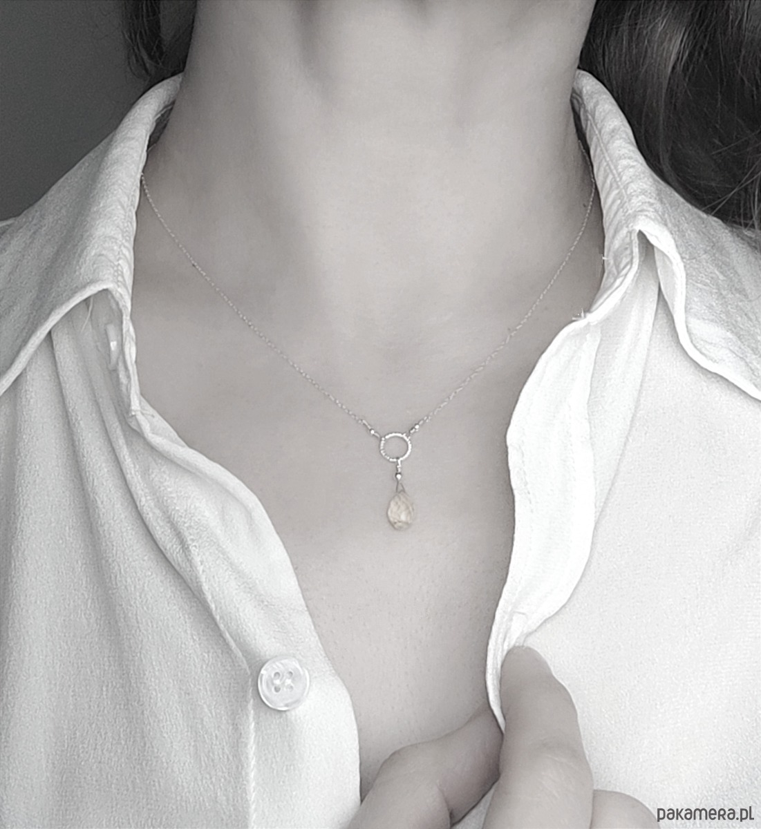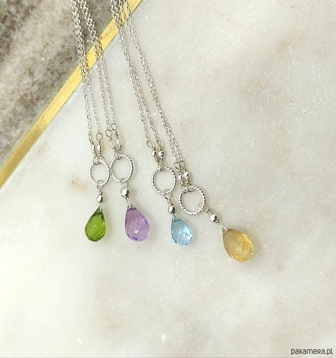Kamień o długości 9-11 mm, fasetowany, transparentny. Wszystkie kamienie są naturalne, mogą nieznacznie różnić się rozmiarem i kształtem. Możliwe różnice widoczne są na zdjęciu z czterema naszyjnikami w dostępnych kolorach.